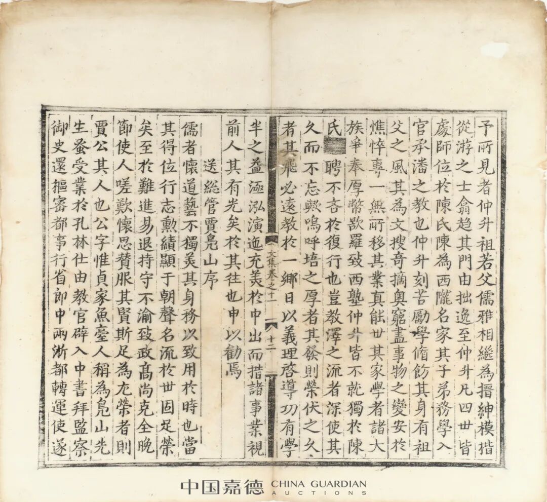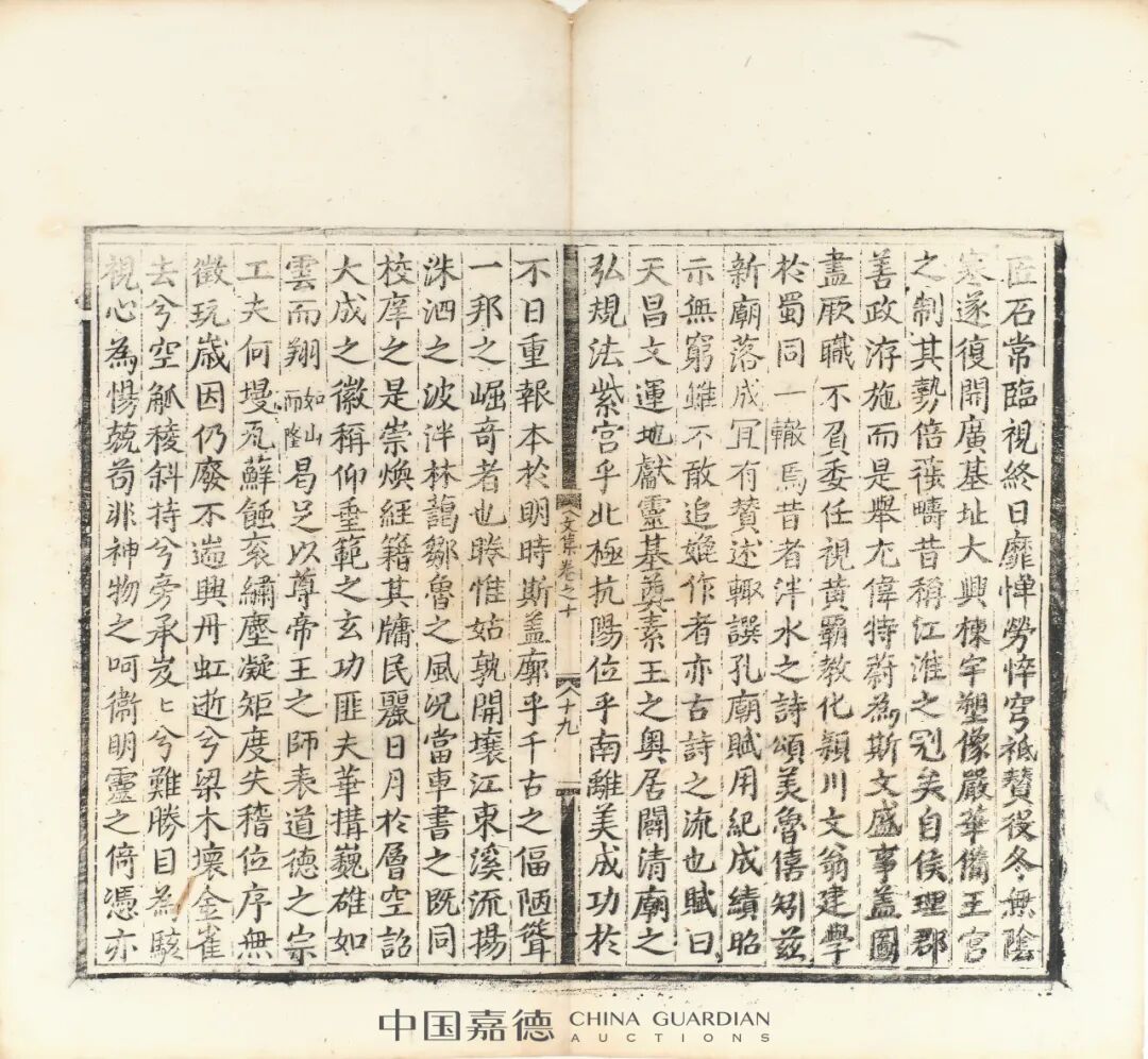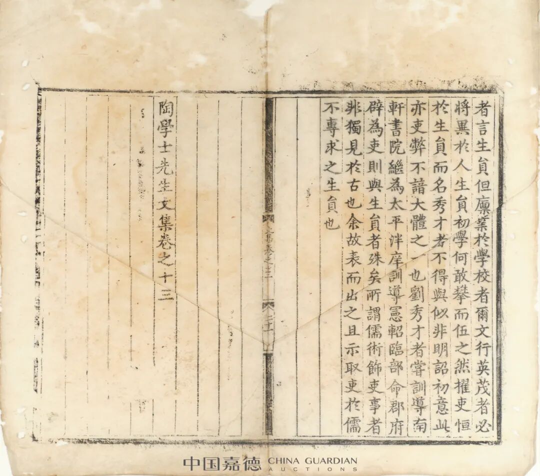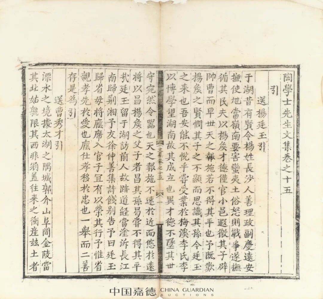 “古籍文献”专场包括明清古籍、文献档案、印谱笺纸等,品类丰富,资料性强。其中,明弘治十三年(1500)项经刻本《陶学士先生文集》白棉纸精印,为明中早期刻本珍贵实物标本。《红楼梦图咏》内收宝玉、黛玉、宝钗、元春、王熙凤、迎春等人55名,前图后赞,为清代版画名刻。