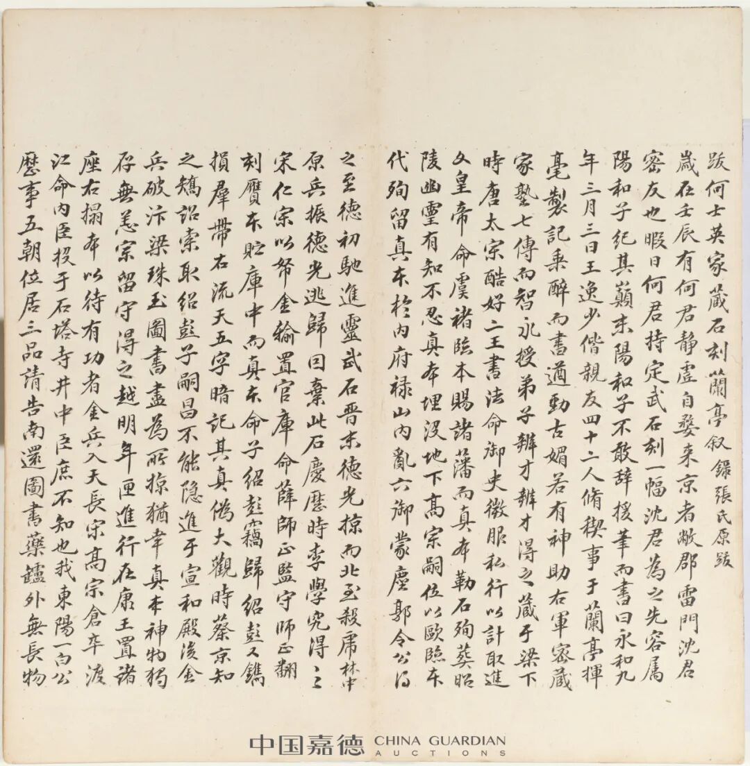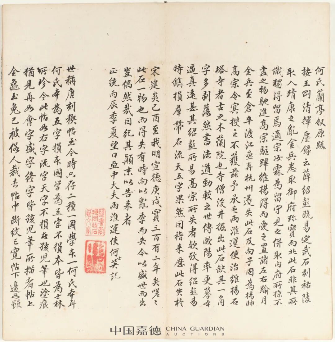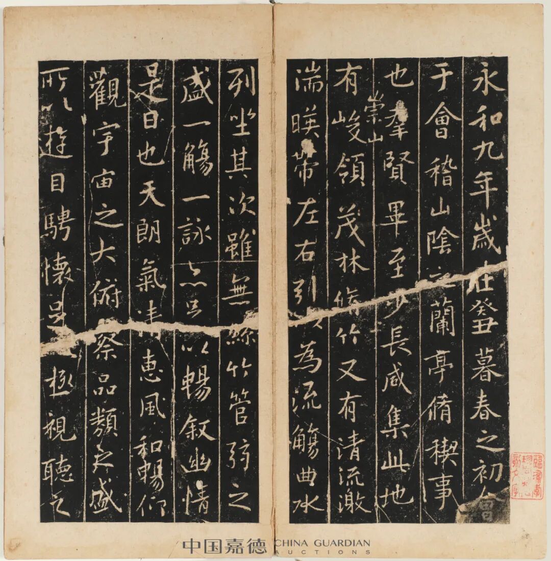 其中汉叔阳食堂画像题记拓尤为稀见,此石汉建康元年(144)刻,为文叔为父母造食堂,右刻二人对坐画像。清方朔谓"道光十三年(1833)鱼台马铁桥得之于凫阳山后,即嵌于家塾之壁。题字共六行,行皆有兰如《天凤》、《石墙村》诸刻。字大如指,隶兼篆体,笔法精隐处亦不在《武氏祠堂题字》之下。"原石曾归端方,张彦生《善本碑帖录》谓"旧拓多只拓中间字画,归端方后多拓四周轮廓全形"。专场之中,有文人刻帖之冠《晋兰亭叙帖》,此次征集为明末清初拓本,清代医家李鉨前后题跋六次,足见珍爱之情。前后织锦封面,绫质签条。