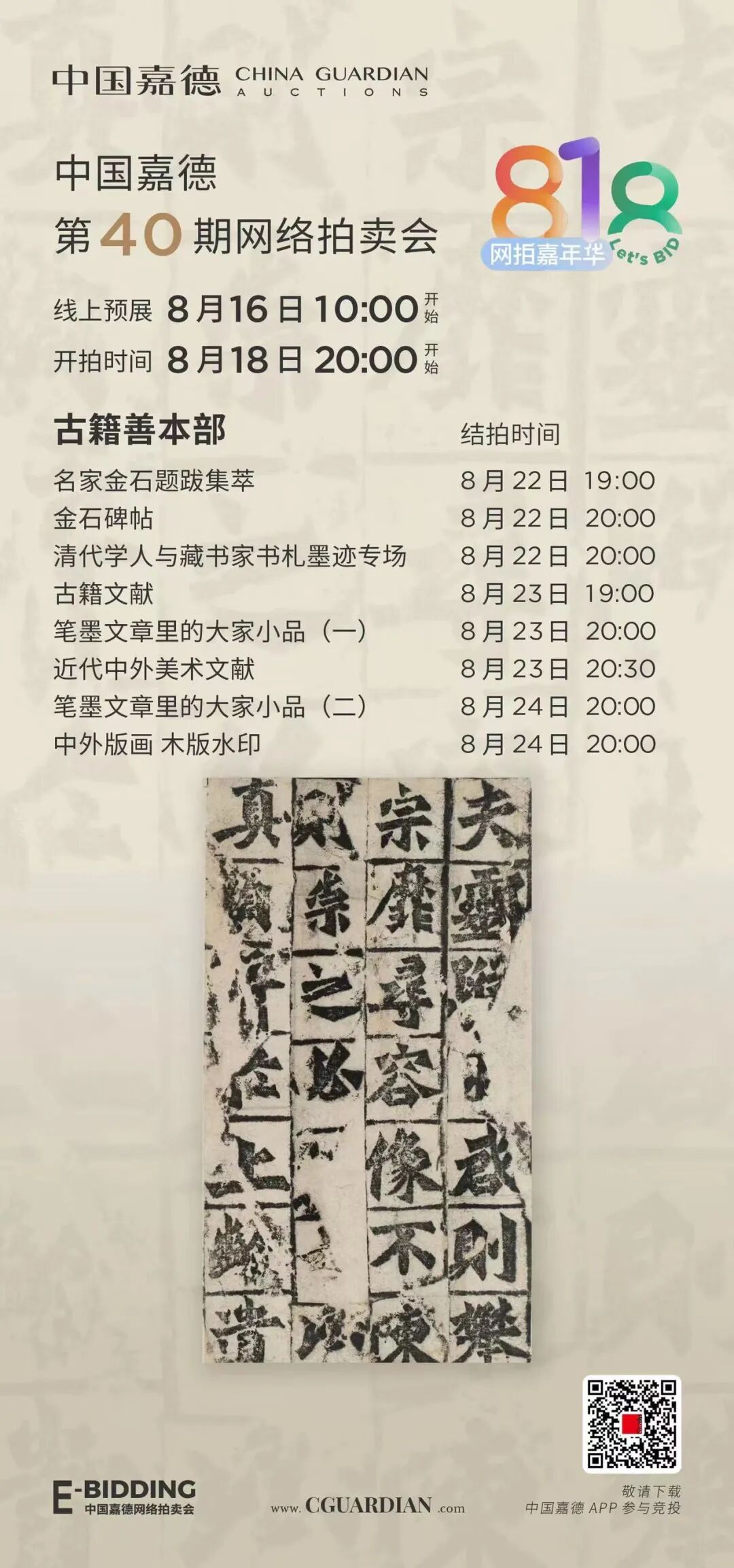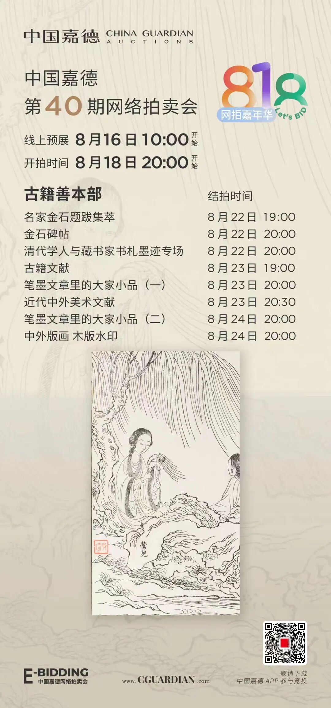 ●请您于参与拍卖活动当日24小时前完成账户注册并交纳保证金。●E-BIDDING提供预约鉴赏服务,敬请关注“中国嘉德网拍”服务号预约。鉴赏地点:嘉德艺术中心B1、B2层(北京市东城区王府井大街1号)。●中国嘉德为竞买人提供查看拍卖标的实物的条件,务请竞买人亲自审看。本公司对拍卖标的不承担瑕疵担保责任。请拨打1501000622015910807786![]()