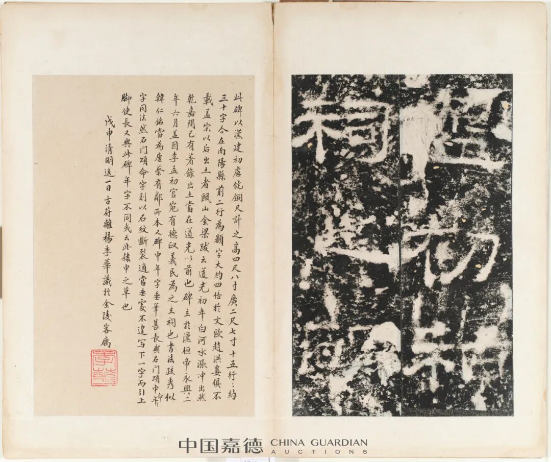 题签:汉宛令李孟初神祠碑。辛卯大暑季华珍藏。钤印:季华、杨士英1、公历一九五一年七月二十四日,农历辛卯年六月六月二十一日,购于古梁溪。钤印:杨士英、季华2、此碑以汉建初虑虒铜尺计之,高四尺八寸,广二尺七寸,十五行,行约三十字,今在南阳县。前二行为额,字大约四倍于文,欧、赵、洪、娄俱不载,盖宋以后出土者。瓯山金梁跋云:道光初年,白河水涨冲出。然乾嘉间已有著录,出土当在道光以前也。碑立于汉桓帝永兴二年六月,盖因李孟初官宛,有德政,义民为之立祠也。书法疏秀,似《韩仁铭》,当为唐蔡有邻所本。又碑中"年"字垂笔甚长,与《石门颂》中"命"字同法。然《石门颂》"命"字则以石纹断裂适当垂处,不遑写下一字,而引上脚使长,又与此碑"年"字不同,或云此隶中之草也。戊申清明后一日,古符离杨季华识于金陵客寓。钤印:季华3、此碑字迹漫漶,旧拓约存一百六十余字,近拓不满百字,碑下截皆剥落,摩灭不复辨矣。兹据《金石萃编》加以旁注。是拓前有杨士英题识,裱边有杨士英据《金石萃编》墨笔所录释文。是碑全称《汉宛令益州刺史李孟初神祠碑》,汉永兴二年(154)立,隶书。碑额文字刻于碑身右侧起首二字,较少见。碑在清道光初年白河水涨冲出,咸丰十年(1860)南阳太守金梁移碑于府署并刻题记,今存河南省南阳市博物馆。端方为晚清重臣,独醉心于金石碑帖之蓄,在清末朝臣中独树一帜。晚清众多石刻原石多经其手,此次“金石碑帖”专场包括端方藏石拓片多件,如汉永寿残石、汉叔阳食堂画像题记、晋枳杨府君神道碑、北魏韩显祖造像记、刘宋刘怀民墓志、隋张贵男墓志等。