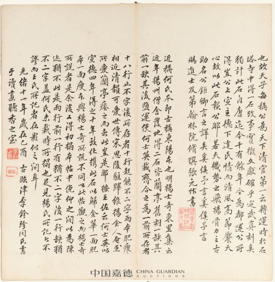 1、跋何士英家藏石刻兰亭叙。录张氏原跋。(文略)钤印:临津李珍同收石刻文字2、近称何氏本即古称东阳本也。明杨士奇《东里集》云:近年扬州僧舍发地得二石,皆兰亭旧刻,一缺其前,一缺其后。盐运史何士英裁齐,合之为一,前所存者十八行,止"不"字,后所存者十行,起"能不"二字。两本肥瘦相近,清韵可爱。世传宋思陵驻跸维扬,金人奄至,所爱兰亭瘗之而去。此岂是耶?按王佐云:何士英以宣德四年得之,十年致仕,携此石以归金华,一面肥本,一面瘦本,与杨士奇所说不同。以此帖观之,而杨士奇所说者是。余后又得初拓本,帖中"俯仰之间"以为"陈迹犹不",此是两行,前一行有"犹不"二字,后一行缺"犹不"二字,盖何氏未裁时所拓也,足见杨氏所记者不谬,而王氏所记者在影似之间耳。光绪十一年(1885)岁在乙酉,古临津李鉁珍同氏书于读画听香之室。钤印:李鉨之印、珎同3、何氏兰亭序原跋。(文略)钤印:临津李珍同收石刻文字、珍同氏4、世称唐刻禊帖至今时只存二种,一国学本,一何氏本耳。何氏本为五字损本,国学为五字不损本,皆为士林所珍。今此帖如"右"字、"流"字、"天"字不损者,孩儿笔也,涂痕犹见。再如"会"字、"盛"字、"终"字,皆孩儿笔所描者。帖上金龟玉兔已被俗人裁去,帖中断纹已宽,帖下边如"虽"字、"欣"字终不由等皆损去,乃国初拓也。虽不如初拓线断本,然至今国初本墨气好者亦不易得矣,可宝藏之。古临津珎同氏又识。钤印:李鉨之印、珎同李珎,字珍同。直隶南皮人。清医家。精天文历算,善堪舆,凡医药卜筮之书无所不读,与张之洞为友。精医术,著有《女科指南》、《医学传心录》。![]()