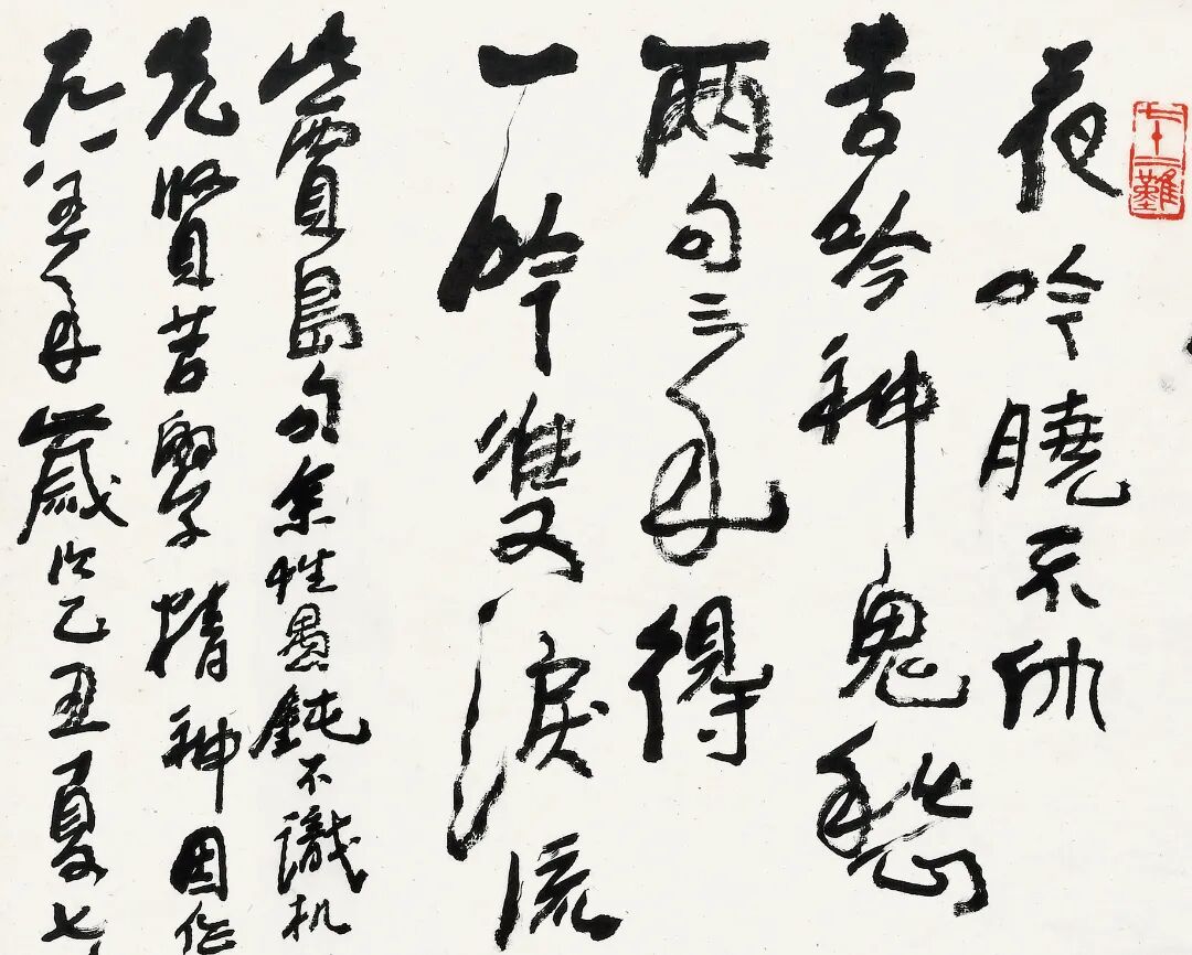 说起“苦吟图”这个题材,着实是很有意义,带有很深的“自我表达”,李可染以“毫无取巧、生拙朴素”的笔触描绘这个黑衣苦吟诗人,其本意有二:一是自我勉励、二是彰显自己的艺术追求。题识写“余性愚钝,不识机巧,生平尊崇先贤苦学精神,因作此图以自勉”,意在自比画面中夜坐苦吟的诗人,表明自己在艺术道路上孜孜以求、苦苦探索的态度。