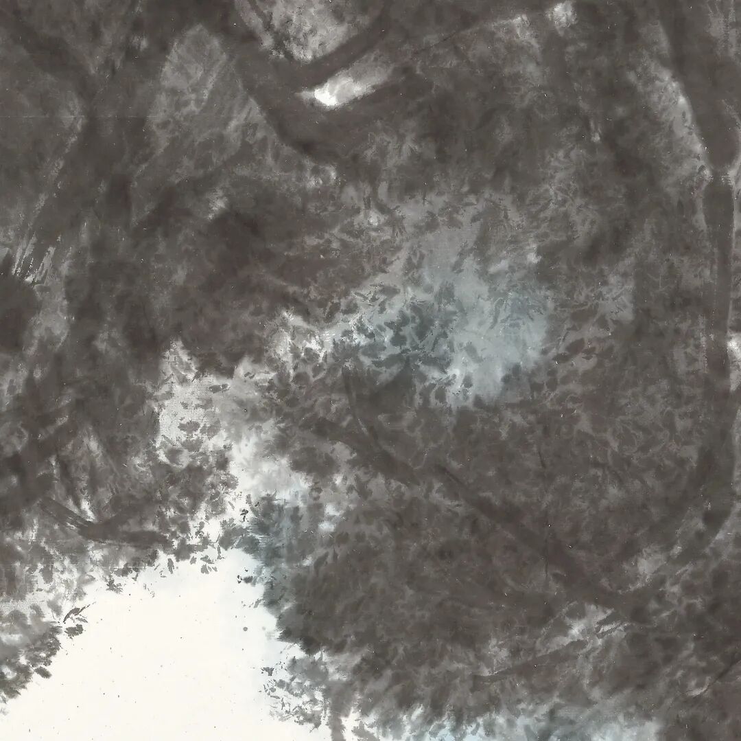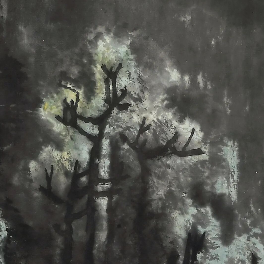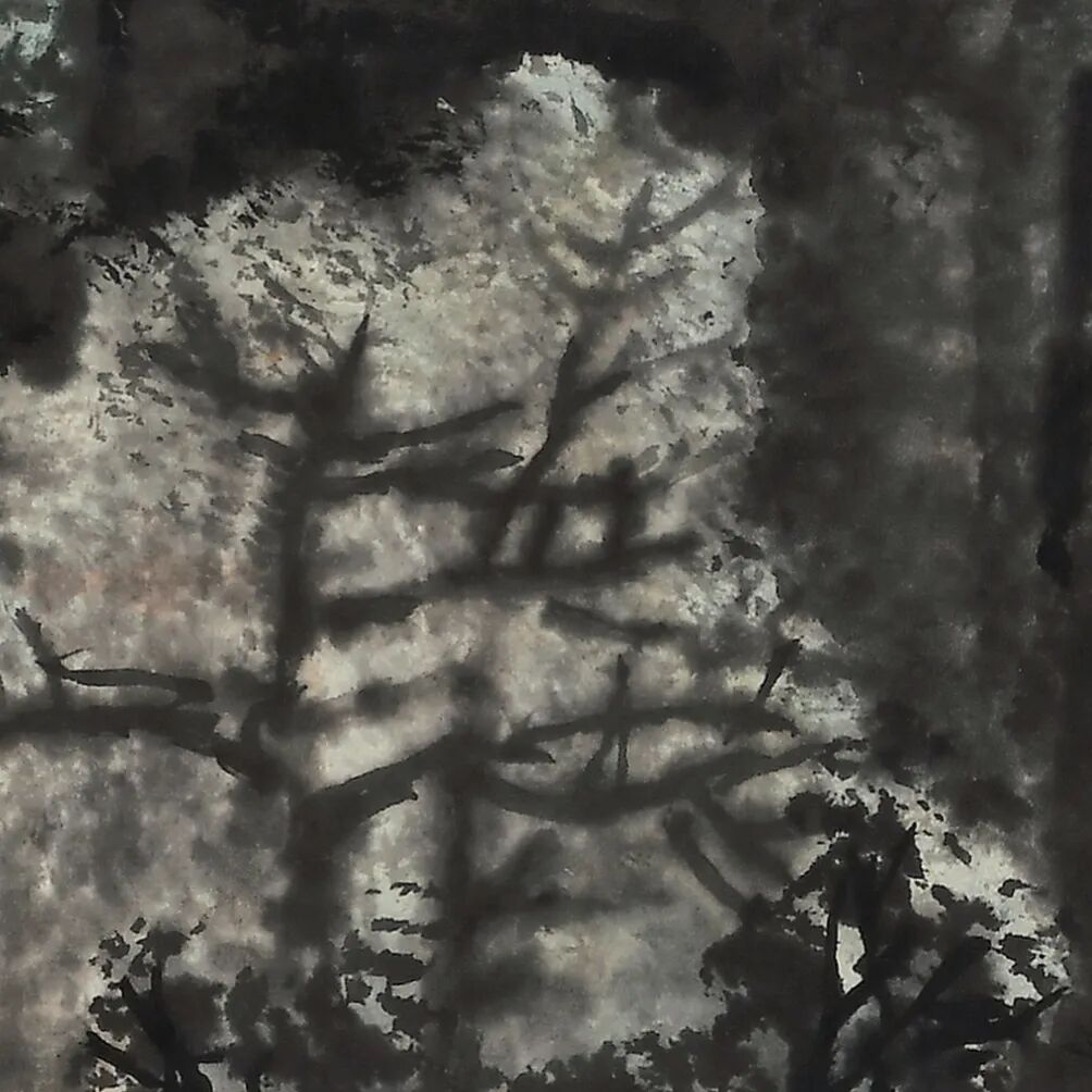 而落实到技法层面,则不能不提他对伦勃朗的吸收与借鉴,后者油画中的高光,化身为李氏画作中的瀑布、江河或云气,是李可染山水重要组成。而光线与光感的微妙变化,在《雨后山林鸣管弦》的局部中有着充分的体现,看似都是树荫,其实棵棵不同。
