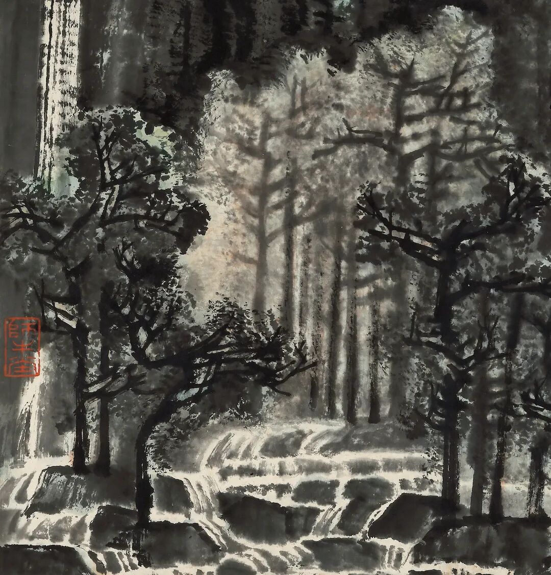 对《雨后山林鸣管弦》这件作品的理解,应该从两个方面来进行:其一、李可染描绘这一题材,是其追求“为祖国河山立传”的实例,他曾有画题“余昔年居蜀中,巴山夜雨,万壑林木,葱郁青翠欲滴,奔流急湍,如奏管弦。对景久观,真画中诗也。此情此境,令人神驰难忘,故一再写之,以赞祖国河山之美。”这可以解释他对这一主题的追求与探索。
