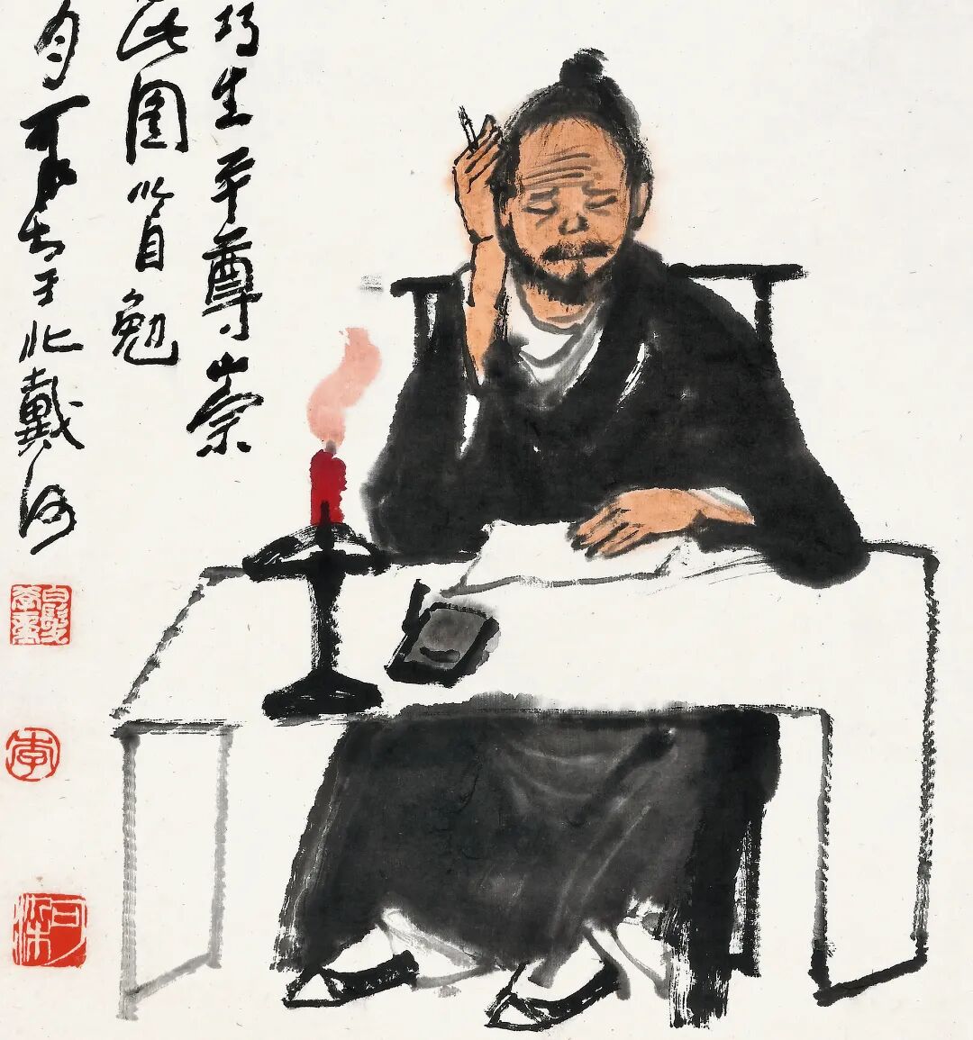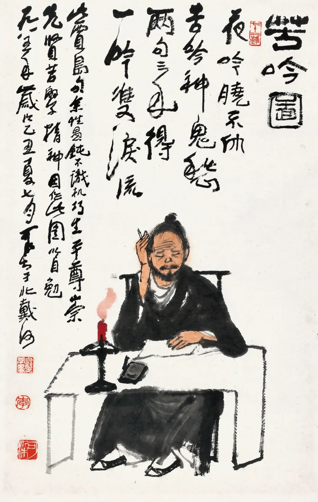 题识:苦吟图。夜吟晓不休,苦吟神鬼愁。两句三年得,一吟双泪流。此贾岛句。余性愚钝,不识机巧,生平尊崇先贤苦学精神,因作此图以自勉。一九八五年岁次乙丑夏七月,可染于北戴河。