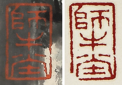 磕角前后的印章对比,左图取自《雨后山林鸣管弦》