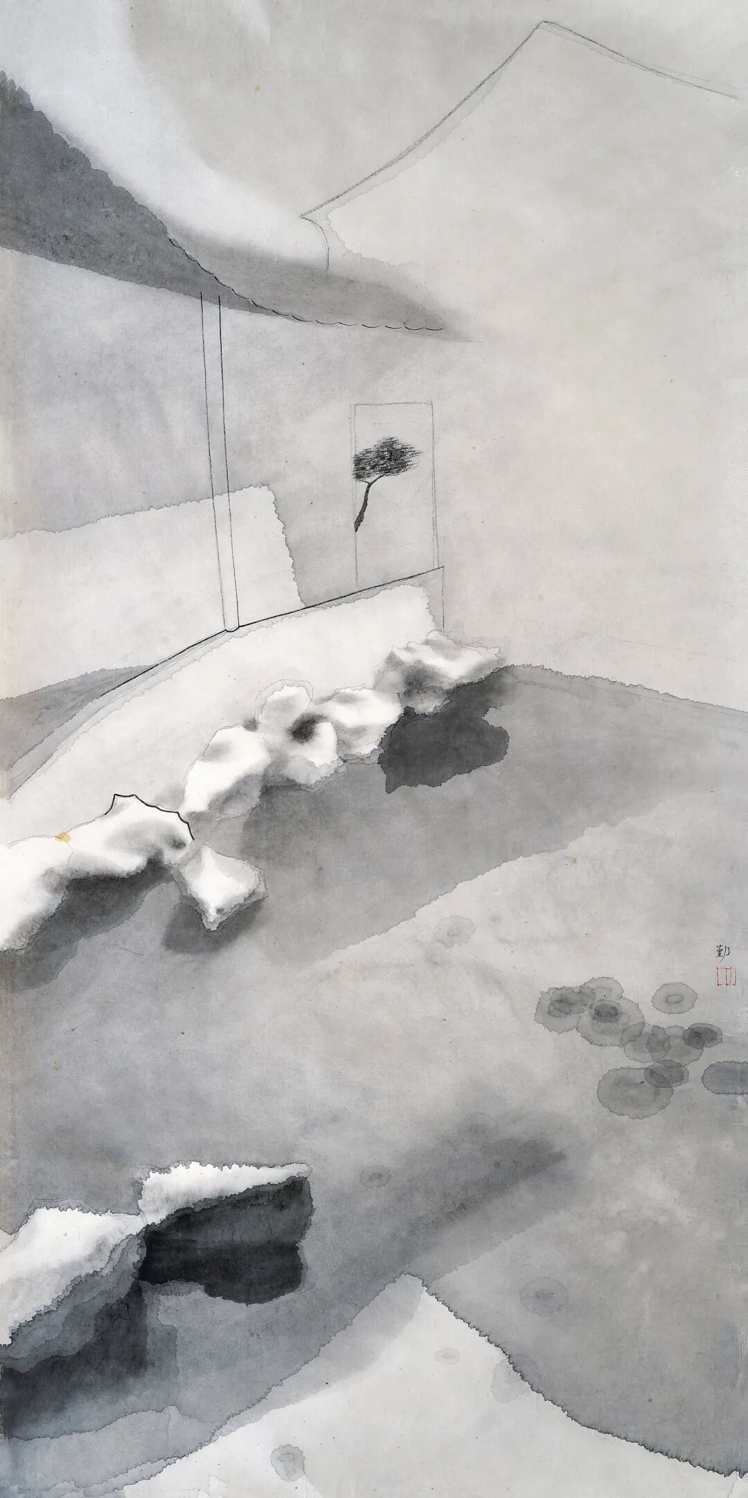 《园·穿过门的树》恰如一个被虚淡的笔墨过滤的世界。画中所有叙事内容似乎都被消除,只有着大量简化的艺术处理,多层次的淡染掺杂着干笔勾勒,以及微妙的黑白平衡。左侧的走廊并没有交代来去,但凭着其浓郁的苏州庭院结构和现代工业化倡导的精简细条,不禁让人想象走廊的一头似乎连接着过去,另一头连接着未来,而立于两者间的门则是“现在”。细线勾勒的柱子、屋檐和墙面既似存在又不存在,似是对文化经时间磨砺的探讨,又似叙说着物质与意识间的双向转化。在这个看似纯空间描述,其实是艺术家尽量把情绪积压,直至笔落到了门上,才流露出一丝淡淡的情绪。