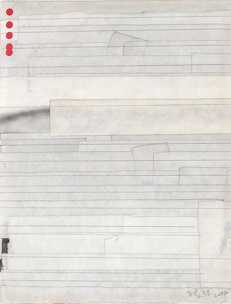 这次亮相的两件拼贴作品《日记No.7》《日记No.9》,是艺术家2000年之后的典型创作,在轻重有序的晕染、层层措置和堆叠、有形与无形的秩序重建中,表达了对中国传统绘画中写实和写意的思考。“日记系列”画面雅致、自然,色彩淡雅、清明,层次丰富且细腻空灵,将中国传统意境的审美体验融汇于朴素淡雅的抽象水墨之间。这正是2000年之后,梁铨以茶入画,微妙地将自己的哲学观和生活美学态度,兼容并蓄地融入创作之中的体现。梁铨说他将水墨的自然性与空无性悠然自得的加以发挥,创作归属转向个人心迹和生命态度的疏理,从现象回归本质,由纷然杂沓复归平静淡默。