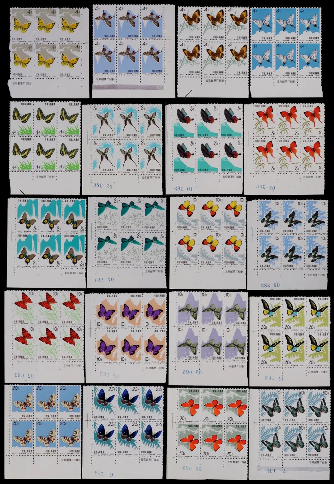1963年特56蝴蝶新票全套六方连带下厂铭纸边1884号1964年特61牡丹新票全套版张,牡丹新票版张目前仅见不足五套,品像好更加珍罕。