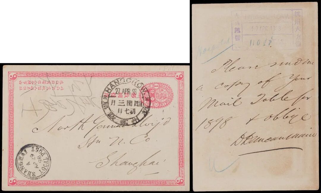 清一次邮资片1898年杭州寄上海,销“杭州邮政局廿四闰三月初七日”英汉大圆日戳。杭州大圆戳已经非常少见,由杭州始发销杭州闰月大圆戳之邮资片目前仅见。