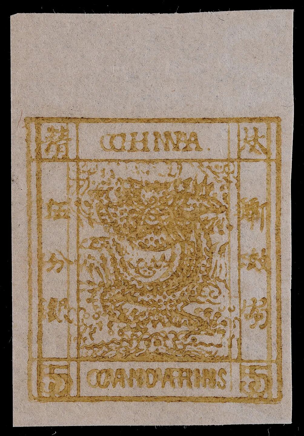 1877年万年有象图伍分银无齿样票一枚,印于较厚纸张上,第一排第五号位置,非常珍罕。此枚源于英国大卫德爵士(Sir Percival David)原藏带有左上直角横五一件,即全张第1至5号,此横五连于1970年经伦敦罗布森罗公司(Robson Lowe Ltd.)拍出。据著名集邮家赵岳先生统计,除了仅存的全张外,目前存世最大连票仅有横双连,馀均分拆成若干单枚,并经拍卖等途径递藏,而第1/5号位单枚从1970年拍卖后,至今未曾发现流转资料。