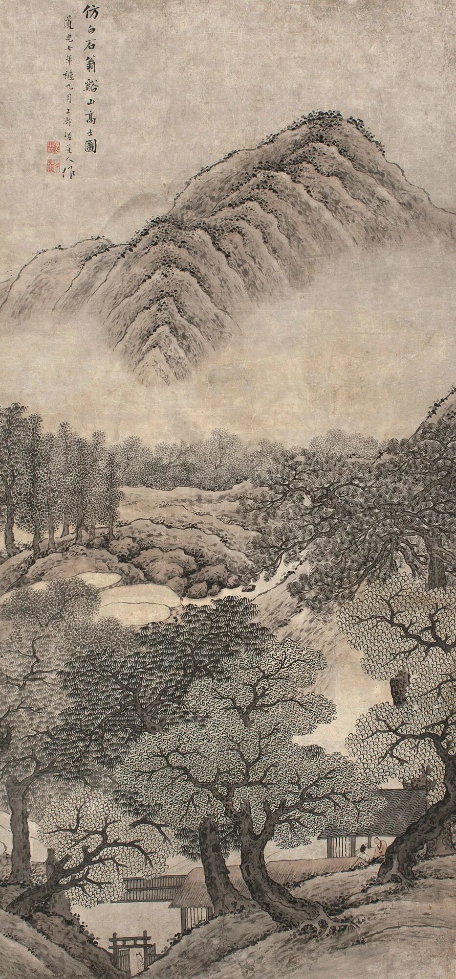 题识:仿白石翁溪山高士图。道光七年秋九月上澣,槎道人作。