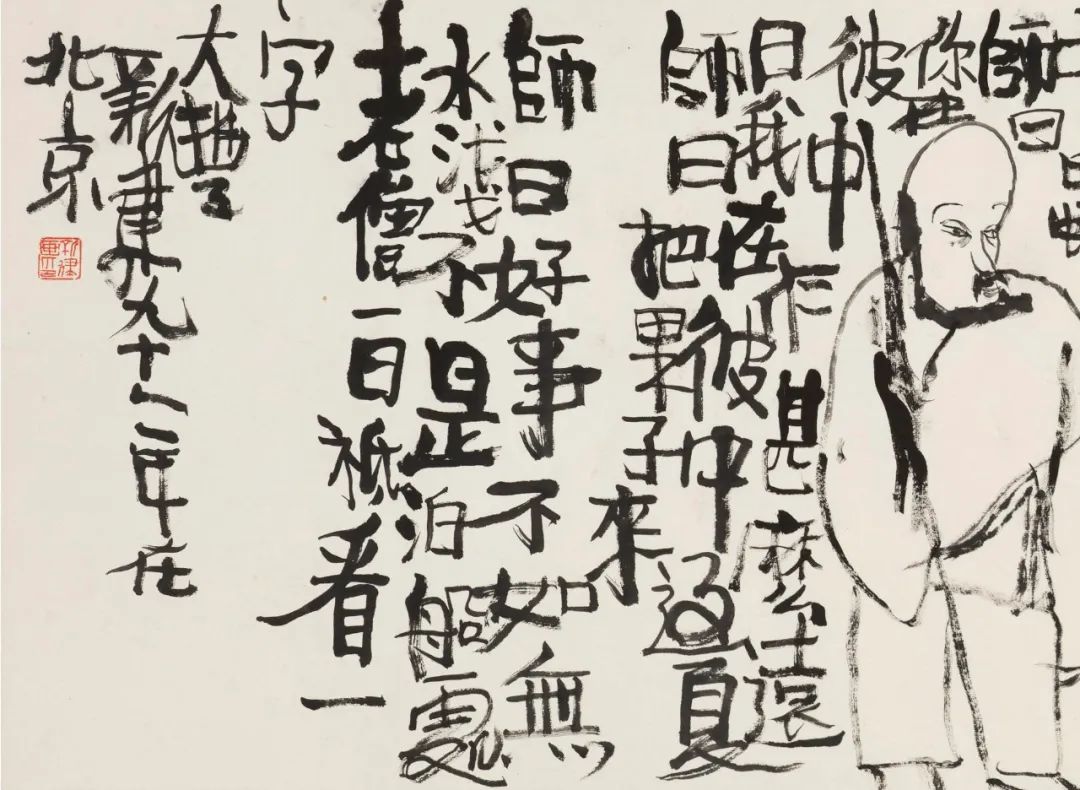 大丰新建,别号“除了要吃饭其他就跟神仙一样斋主人”。其诙谐、达观的快意人生,传颂艺林。殊不知,“快活事情”背后的岁月点滴:出生于五十年代,在特殊的时代氛围下,经历了压抑荒唐的青春岁月。于是便有了80年代初的风格爆发,那些仅供自己和挚友把玩的“小脚美人”系列;又如1991年从法国游历回来后,与亲人天涯相隔,有感而发,作《有馀图》,跋文曰:“愿家家有馀,愿天下有情人终不分手。新建泪写给小衍,一九九一年时在北京。”画面中的两副碗筷,诉尽内心深处的殷殷柔情······