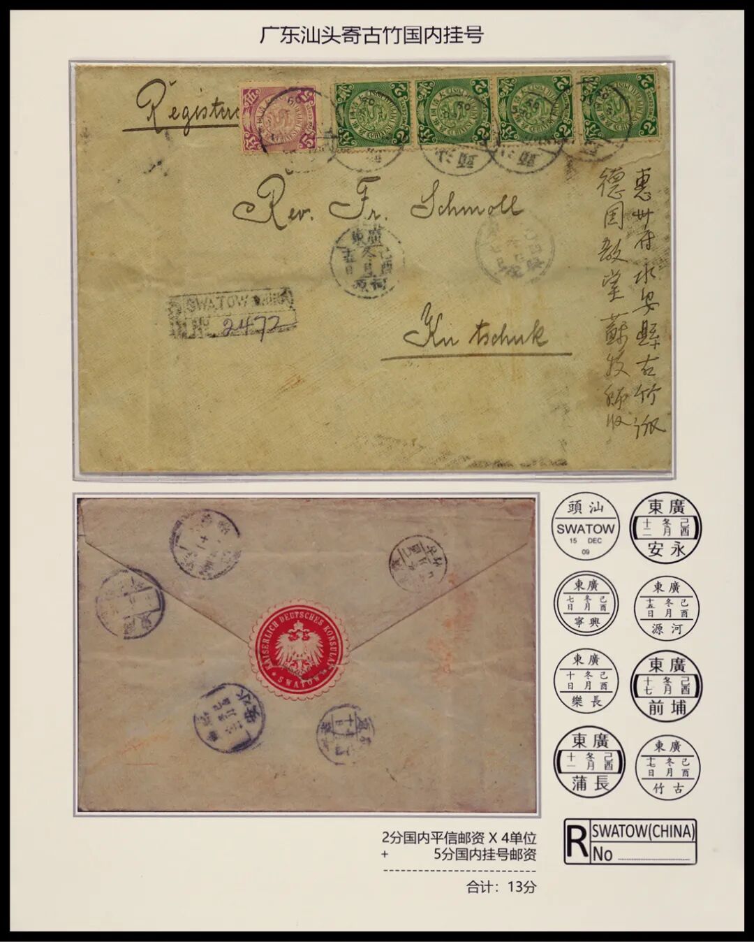 1909年广东汕头寄古竹挂号超重西式封,贴蟠龙2分四枚及5分一枚,计邮资13分(平信2分+续重6分+挂号5分)销汕头12月15日小圆戳,盖R挂号戳,中转分盖兴宁、长蒲、永安、河源、埔前等地不同款式,落地广东古竹冬月十七日到达戳,邮路清晰少见,多戳清,保存完好,带展页