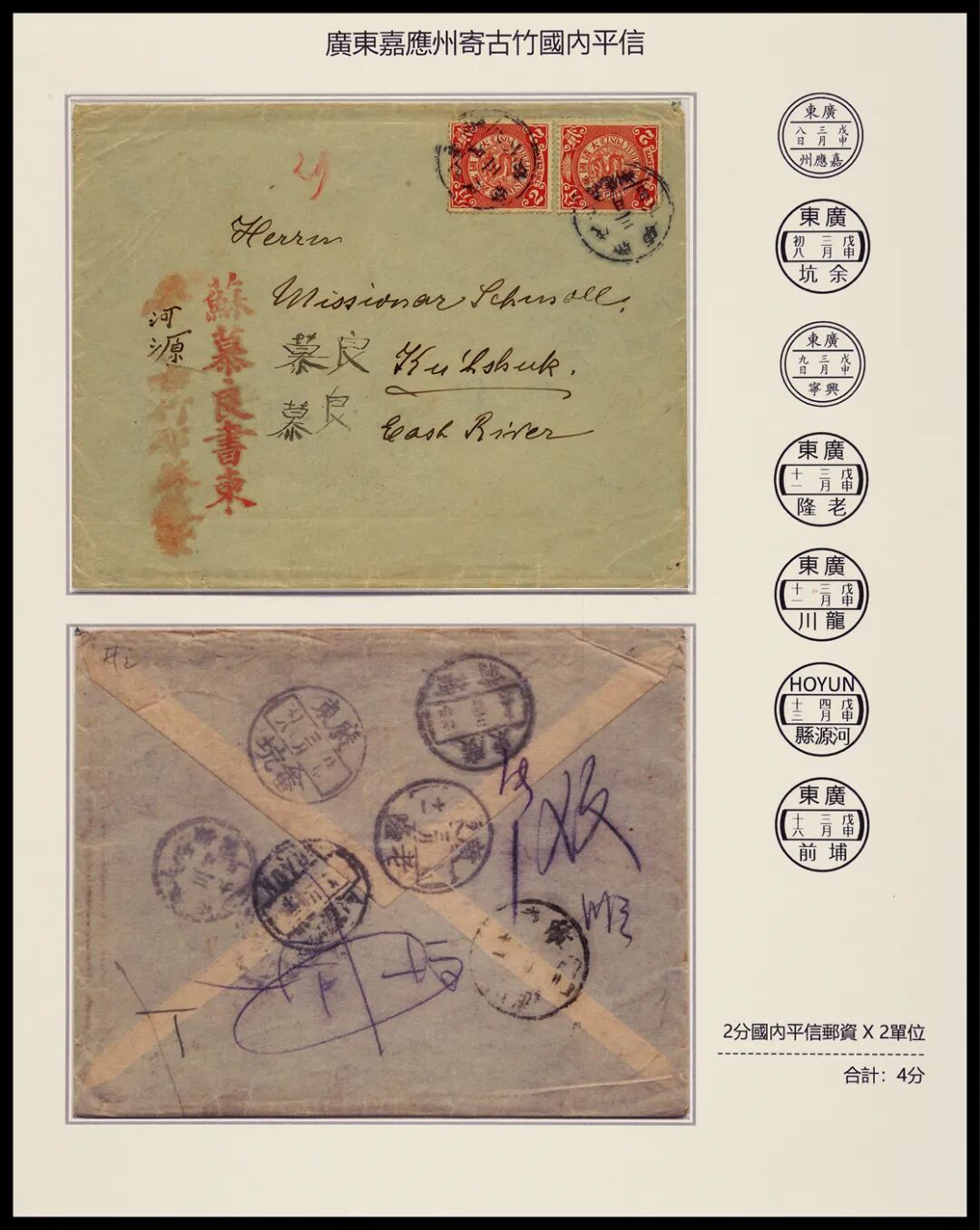 1908年广东嘉应州寄古竹超重平信封,贴蟠龙2分二枚,邮资4分,销嘉应州戊申四月十三日双圈小三格干支日戳,邮路中转分盖畬坑、兴宁两地双圈小三格干支日戳及老隆、龙川、河源县、埔前戊申四月二十不同款式英汉或全汉腰框干支日戳,邮路清晰,多戳清,保存完好,带展页