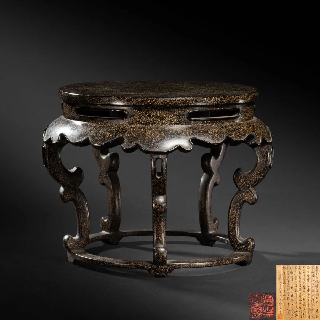 清宫造办处不仅制作大件家具,还负责为宫中器物配制底座、盖等,其设计精巧,工艺卓越,亦可独立成器,艺术价值不让大件家具,可谓平分秋色。故而御铭器座在这一时期大量出现,这类器座所用工料十分讲究,往往楷书或缪篆器名、编号等。乾隆帝亲自参与过大量铜古器纂稿修订,因而器座还填金阴刻「乾隆御鉴」、「乾隆御玩」、「乾隆鉴古」等款识。