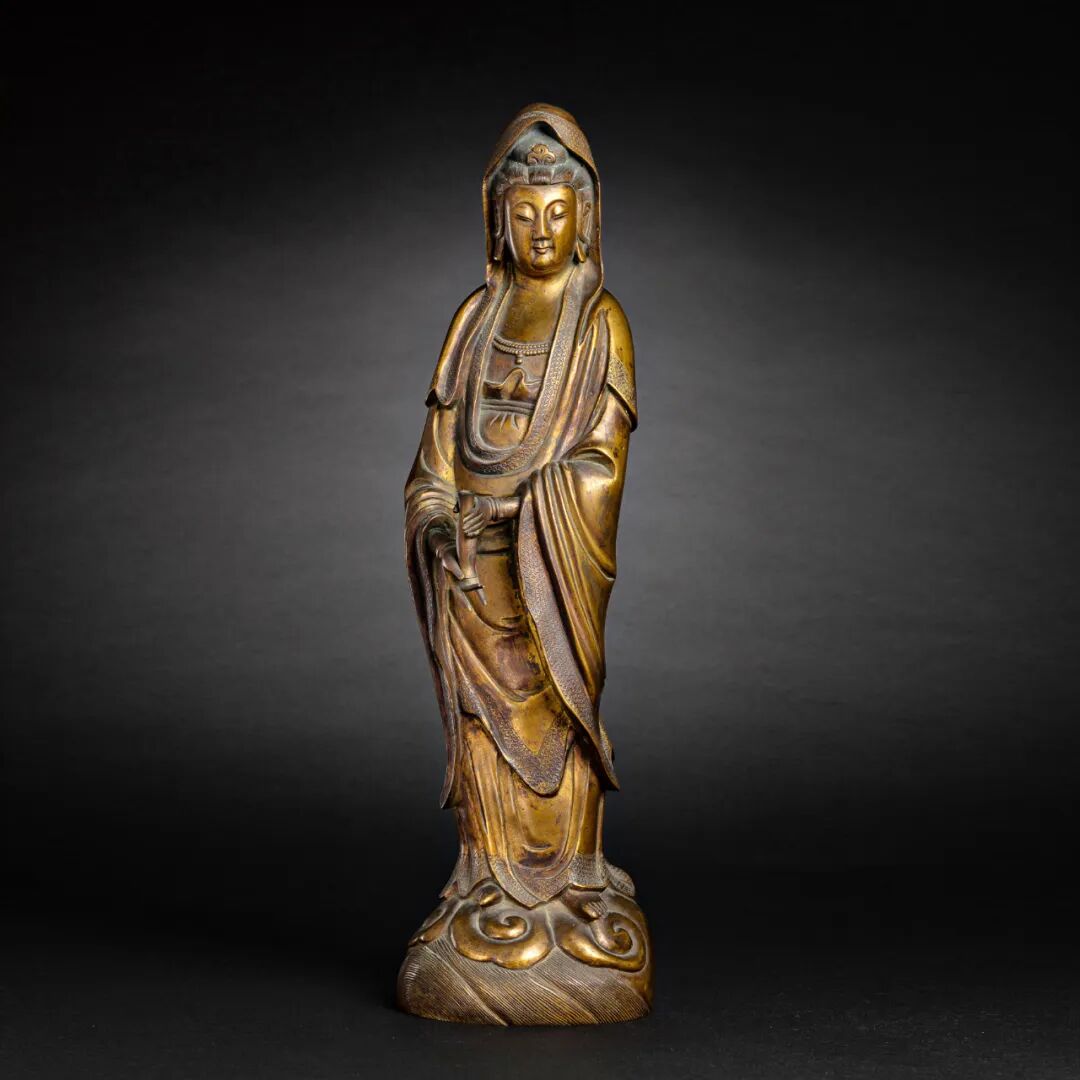 此座观音大士像铜质鎏金,直鼻小口,目光慈祥,庄重娴雅,衣纹随形体处理,简洁畅,手、足、发刻划准确、细致,宽额丰颐,眼睑低垂,目光下敛,面示慈悲。观音手持宝瓶,赤足立于海水纹座上。衣带飘飘,柔美流畅。长裙曳足,下摆翻卷若迎风飘拂,衣纹简练丰满,流畅自然,其雕塑的艺术性已经远远超乎了宗教功用。尤其是对菩萨慈悲悯人的神情与雍容大度的仪态的生动刻划,绝非普通工匠所能企及,而精炼的材质,更增强了作品的艺术表现力。整像材质细腻,包浆醇厚,人物造型雍容典雅,带有明以后中原汉地菩萨造像的鲜明艺术特色,极为符合当今世人的艺术审美。