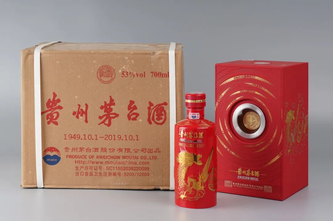 2019年贵州茅台在建国七十周年之际重磅推出--建国七十周年纪念酒。瓶身和盒身采用传统喜庆的中国红为基调。盒身正面采用的是树木年轮样式,用金色"年轮线"勾勒而出,金色"年轮线"中间有建国70年以来,历年国家大事时间记录。瓶身金色飞龙缠绕,此款茅台纪念酒酒盒设计别具匠心,嵌入式盒体,拉开盒身,可以看到盒身外部侧面和盒体内部侧面图案刚好组成"China"字样的金色飞龙形象,除了祥云围绕之外,还有诸多70年发展的标志建筑和科技发展代表性事物。诸如东方明珠塔、上海世博会中国馆、火箭形象等。建国70周年茅台纪念酒限量发售,容量为少见的700ml,并且为陈酿酒质。
