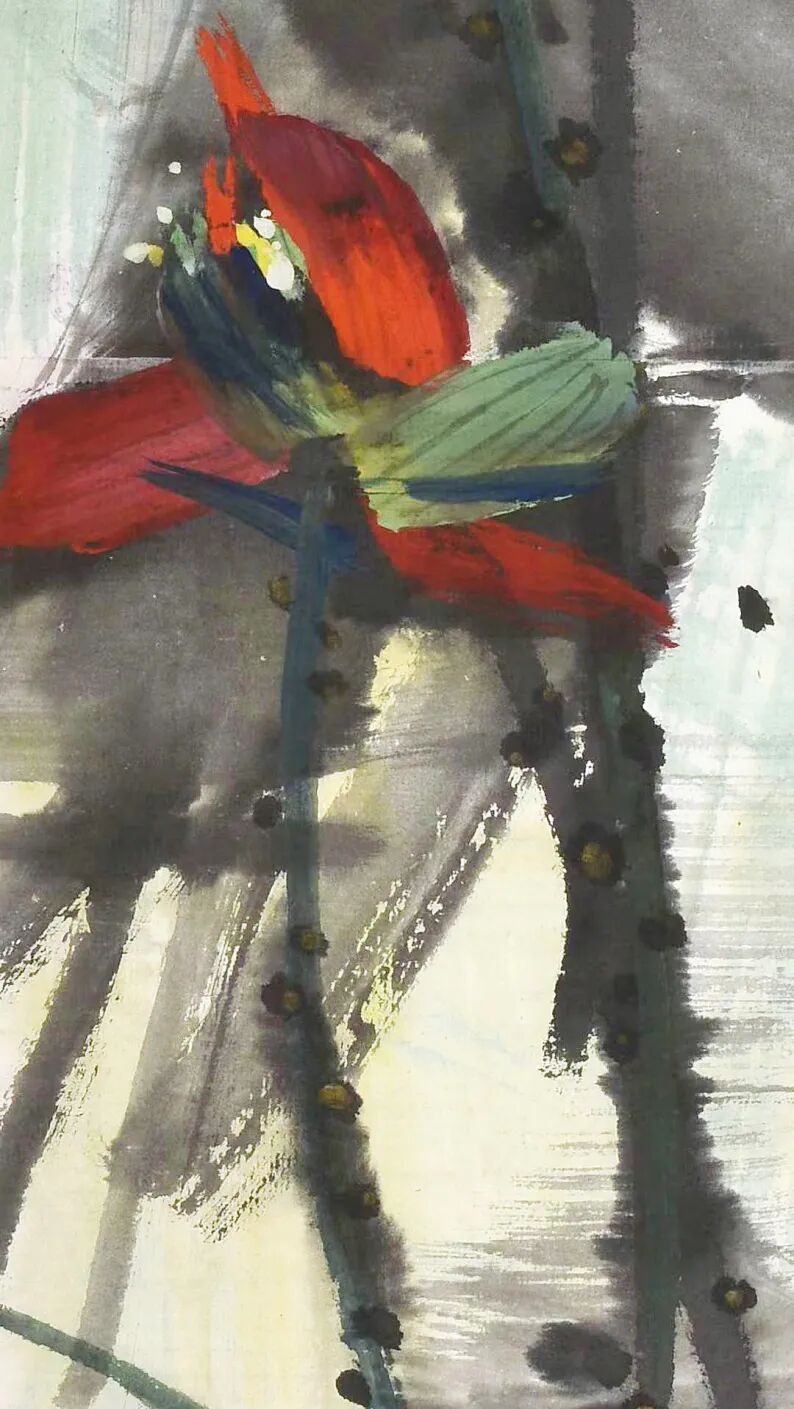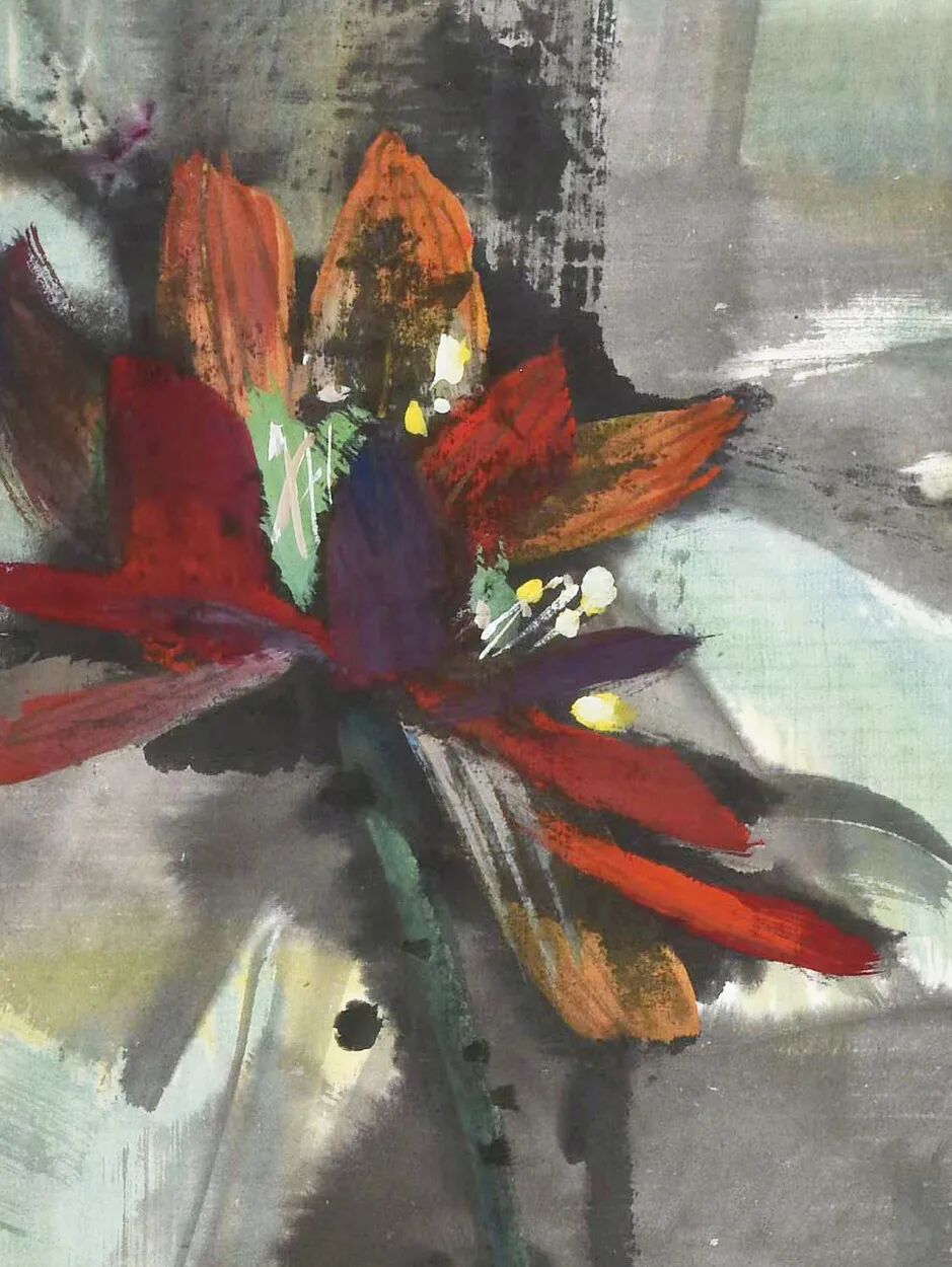 此幅构图和意境延续了东方绘画特点,而在色彩和用笔上又有所突破。 黑、红、蓝、形成鲜明对比,使画面更有动势,使荷花超脱了清新、淡雅的传统境界,表现出来的则是画家内心绚烂、多彩的世界。