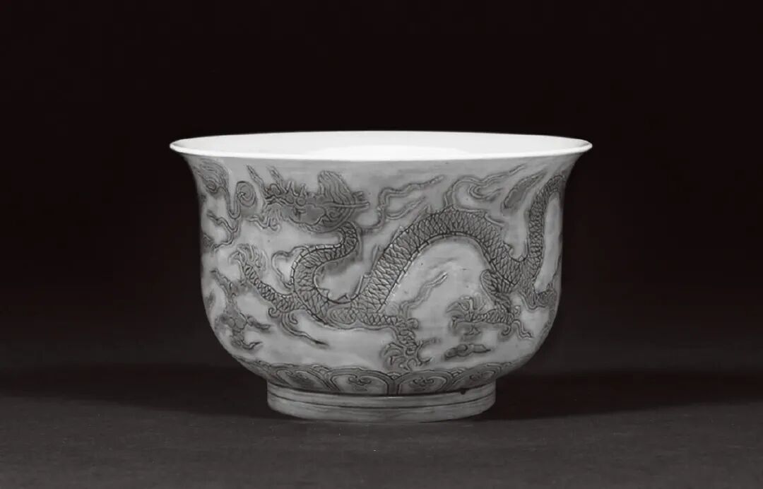 拍品胎体厚重,内壁施白釉,厚釉处色泽泛青,时代特征明显;外壁口沿起凸棱一道,以黄彩为地,锥刻纹饰并填绿彩,饰九条五爪龙腾跃于海面之上,或正面飞翔,或两两相对戏耍宝珠。整体器形周正,纹饰黄绿彩色泽鲜艳,为嘉靖官窑中少有的珍品。