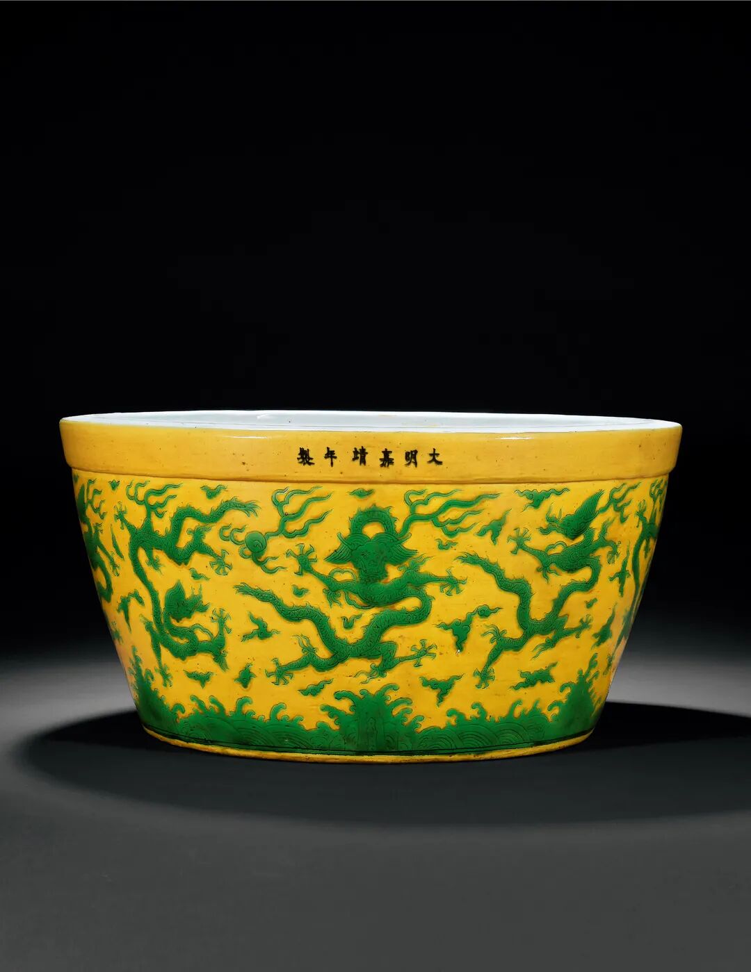嘉靖年间烧造的瓷器相比前朝,大尺寸品种明显增多,如大缸、大盖罐、大梅瓶、大葫芦瓶、大盘等。其中大缸的烧造多次见诸文献记载:明王宗沐《江西大志·陶书》“御供”条有“二十三年(1544)……外青双云龙宝相花缸一百二十口”、“二十五年(1546),青花白瓷青双云龙等花缸三百口”;《明会典》卷一九四“工部(十四)·陶器”载,“嘉靖三十一年(1552),各宫殿及御酒房花园等处烧造瓷缸”。虽文献记载大缸烧造量多且繁,但由于器形太大极难烧成,甚至后来万历时期即因烧造龙缸而激发民变,可见大缸成品数少。目前所知的嘉靖官窑大缸,以青花为主,有云龙纹、鱼藻纹、缠枝莲、瑞狮戏球等纹饰,但拍品则以九龙为饰,且为嘉靖黄地绿彩器中尺寸最大者,甚是难得。
