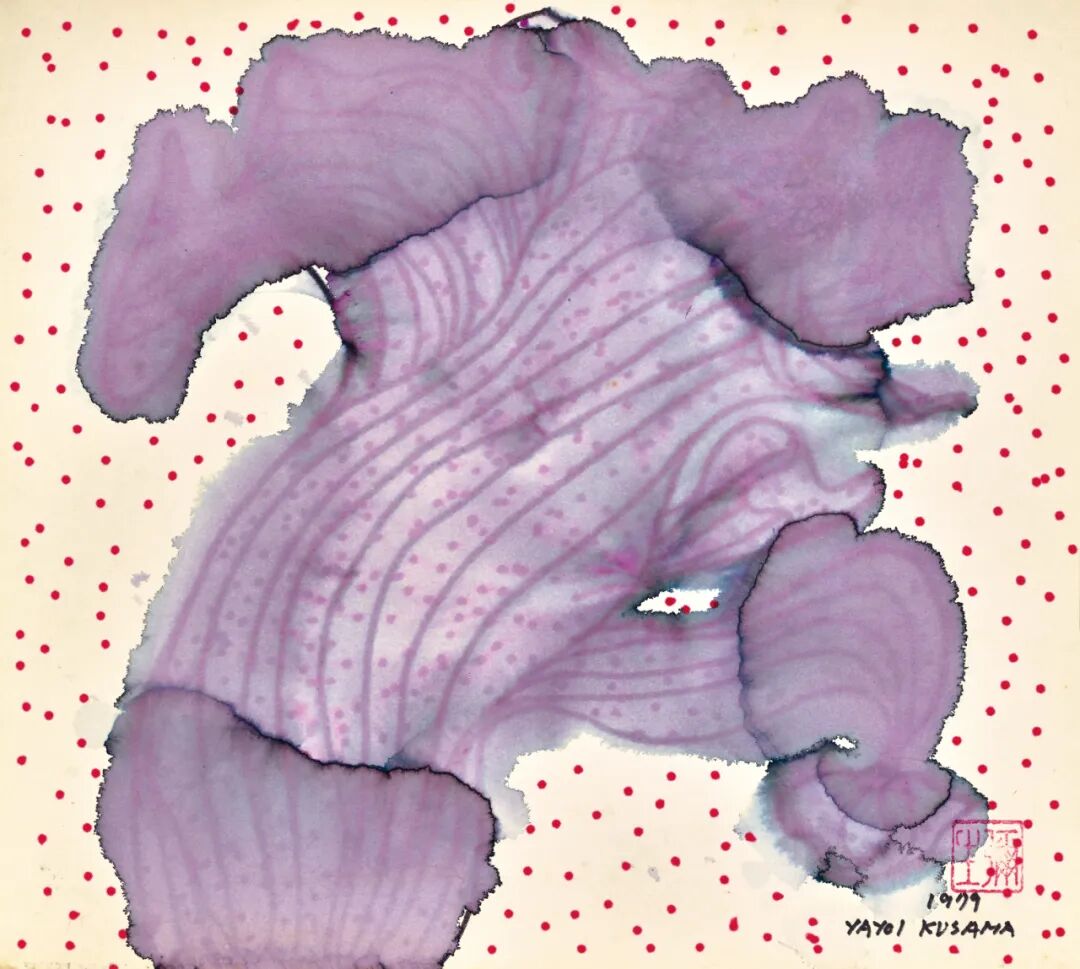 在七〇年代末至八〇年代初,草间以纯粹的水性笔创作了以波点与具像物为主题的一系列藕紫色的创作,当中多描绘高跟鞋、南瓜、蝴蝶等客体,而完成于1979年的《我记忆中的花》则是该系列中罕见的半具象之作。画面以粉紫色的水性笔描绘了正逢盛开之时的一株花朵。晕染的紫彩若绽放的花瓣,中心大面积以纤细的线条勾勒出花茎的条条纹理,挑动着观者的视觉神经。![]()