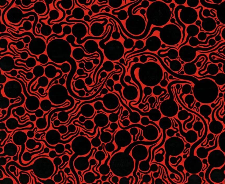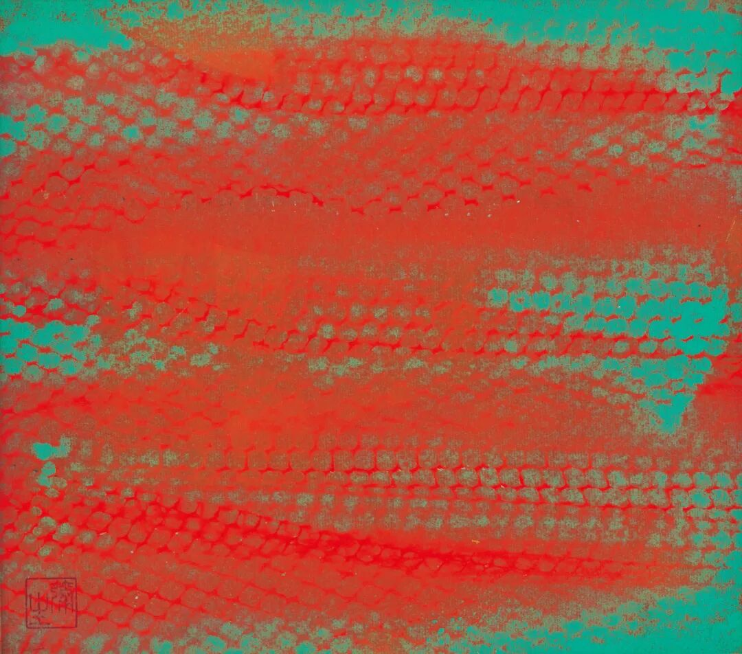 是次上拍的《夜的灵魂》即为箇中代表。草间自60年代末起便藉行为演出,提出对「反战」、「爱」与「性解放」的宣言,直面肉体、欲望等议题。然而在平面画作上,她多采取隐晦的抽象手法,在《夜的灵魂》中,她大胆将画幅施以若带有生命脉动力量的红彩,在其上将对她而言「和地球、太阳与星星形状一样,富有生命的圆点」添加上线条,生成大小不一如蝌蚪的浮游生物,或带有希望象征的豆芽。它们在炙热的红海中,铺天盖地以各自的节奏展现风姿,那回旋、曲折的线条指涉其前进的方向,个别看它们彼此独立,若生命存在的本质,广而视之时它们集结成一个个充满动感的回旋之气,示现着生命的旅程,让人感受个体从初生、启程,及那由复杂人际关系所交织成一片鲜活的生命图景,使人迷醉。![]()