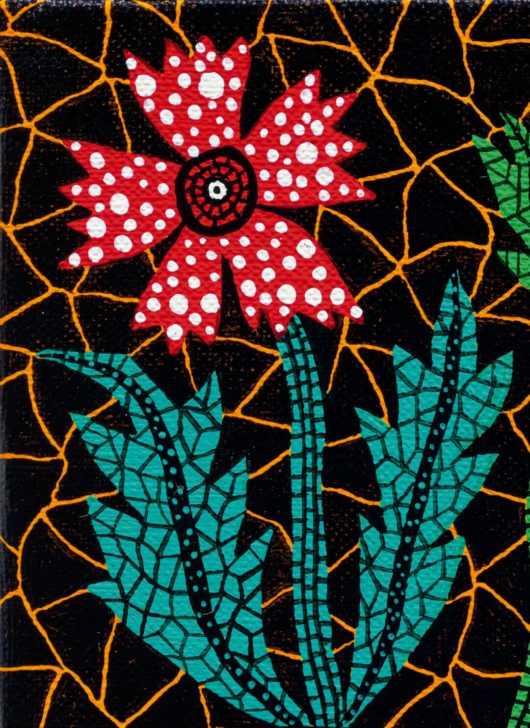 「花」为贯穿草间创作生涯的重要母题,其将作品命名为《我记忆中的花》,概括性的以半抽象的形式完成了对绽放花朵的记忆。而背景的红色小圆点,作为草间弥生经典的绘画语汇,在此可被视作植物的种子,或花儿蕴含的无形色香,展现大地孕生出希望的力量。草间弥生的「无限」世界,在方寸间徐徐开展。