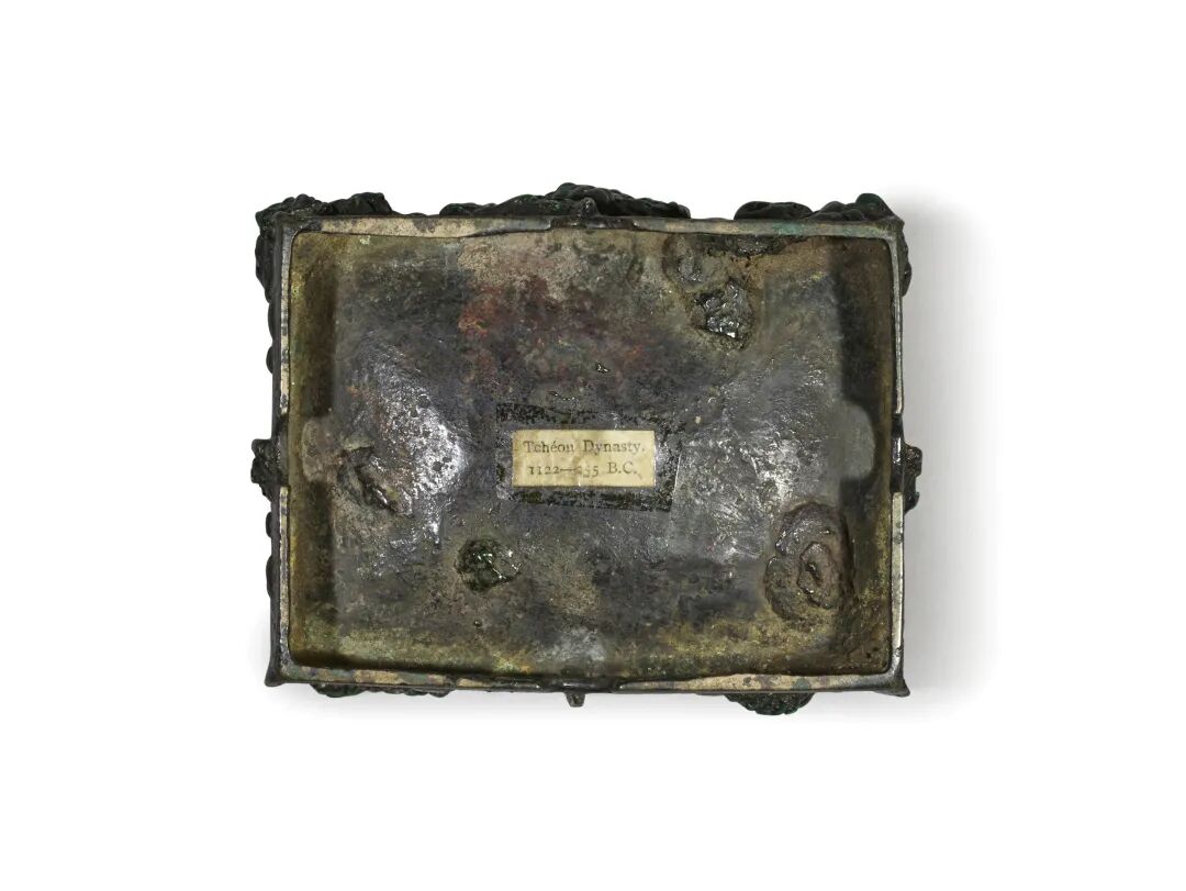 可参考殷墟妇好墓出土一件方彝,纹饰、器型与本件颇似,高度基本一样,亦缺盖,见中国社会科学院考古研究所编,《妇好墓》,北京,1980,页34,图3;又可参考一件殷墟出土之商代晚期子马方彝,缺盖,兽面颇似而无扉棱,高度基本一样,见吴振锋编,《商周青铜器铭文暨图像集成》,上海,2012年,编号13497;另可比较美国旧金山亚洲艺术博物馆藏一件商代晚期方彝,见《中国青铜器全集》,北京,1997年,编号67;第四例可比较一件商代晚期之秝冉方彝,著录于汪涛、刘雨,《流散欧美殷周有铭青铜器集录》,上海,2007年,页323;佳士得纽约2018年9月13日售出一件商代晚期鼎方彝亦资参考,惟无扉棱,拍品编号1106。