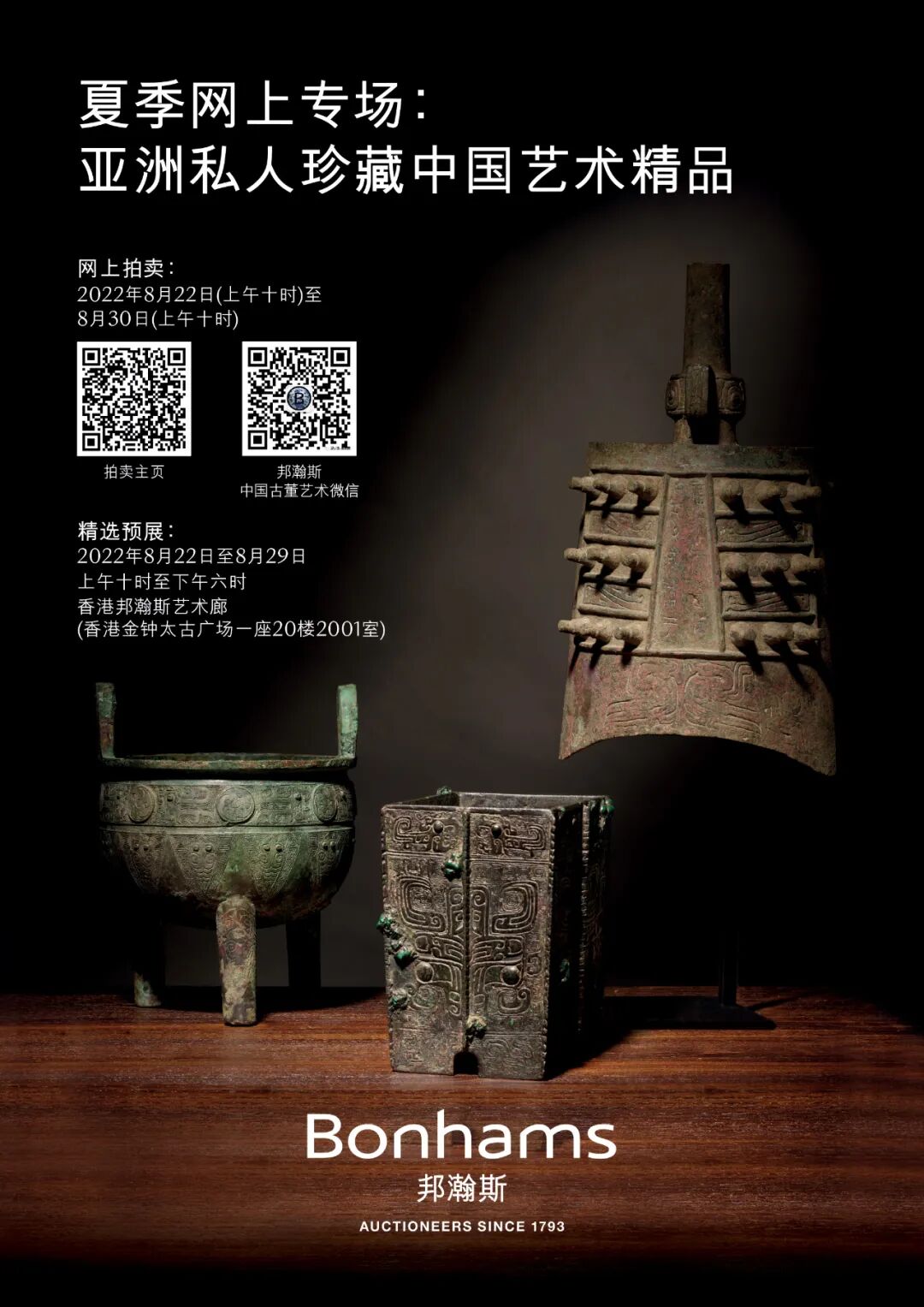 香港邦瀚斯「夏季网上专场:亚洲私人珍藏中国艺术精品」欣呈出自一套亚洲私人珍藏之各式中国艺术雅器,涵盖高古青铜礼器、瓷器、玉器等门类,不一而足,记载商代至民国逾千年中国艺术历史。将于8月22至29日在金钟太古广场一期20楼拍卖中心举行预展,8月30日10时起开始按序截拍。藏品悉数由藏家从国际拍卖会以至纽约、东京及香港各大艺术商囊括而得,流传有绪。