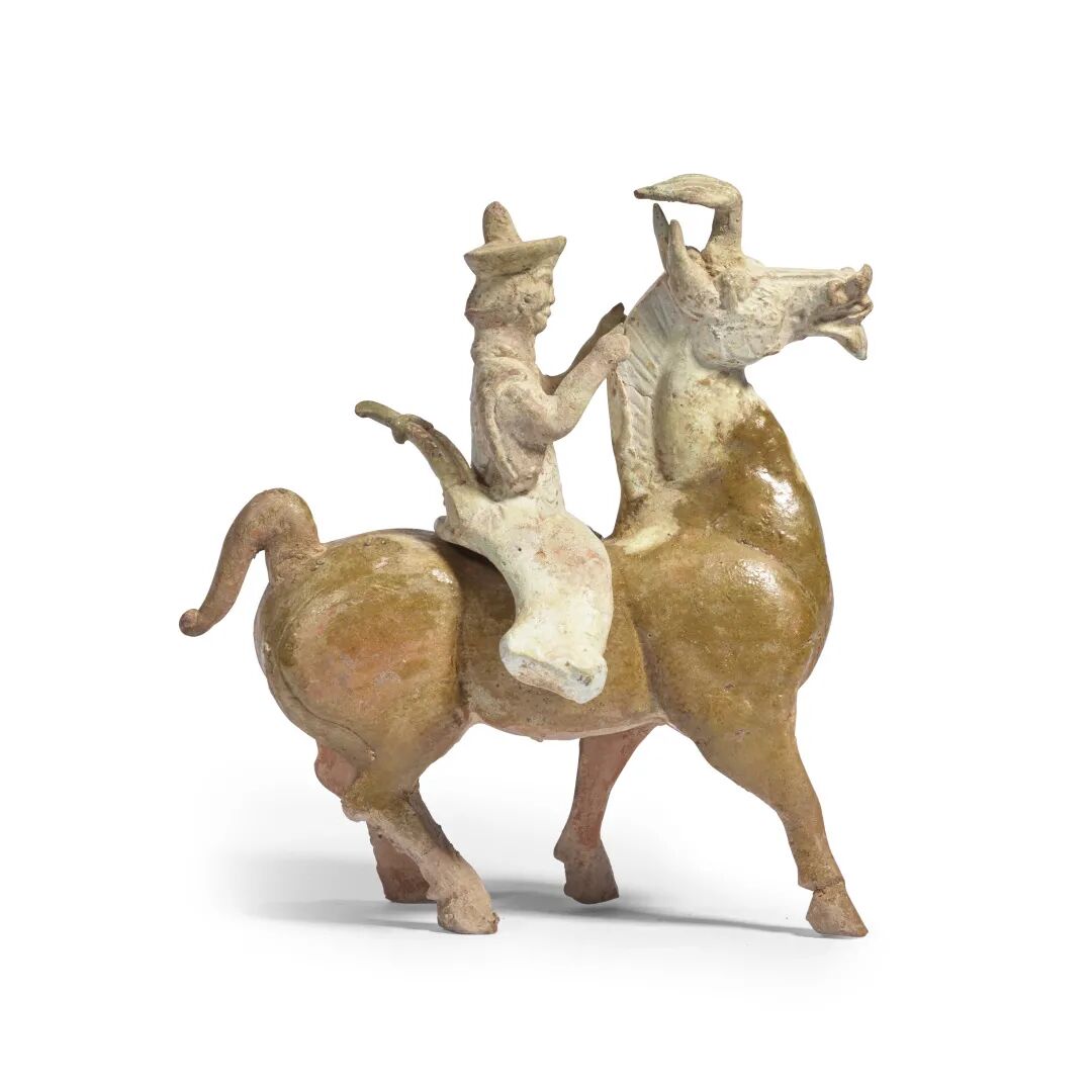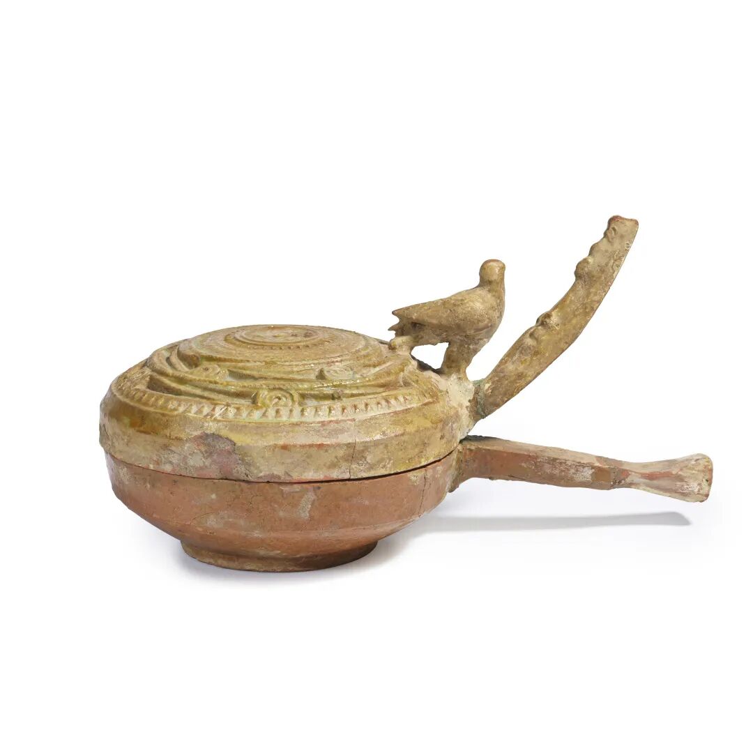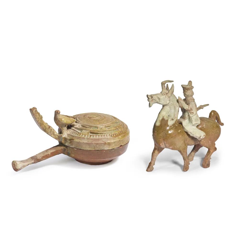 汉 黄釉鸟钮绳纹把炉及黄釉骑马俑 一组两件