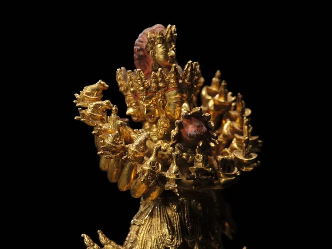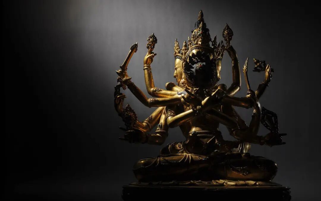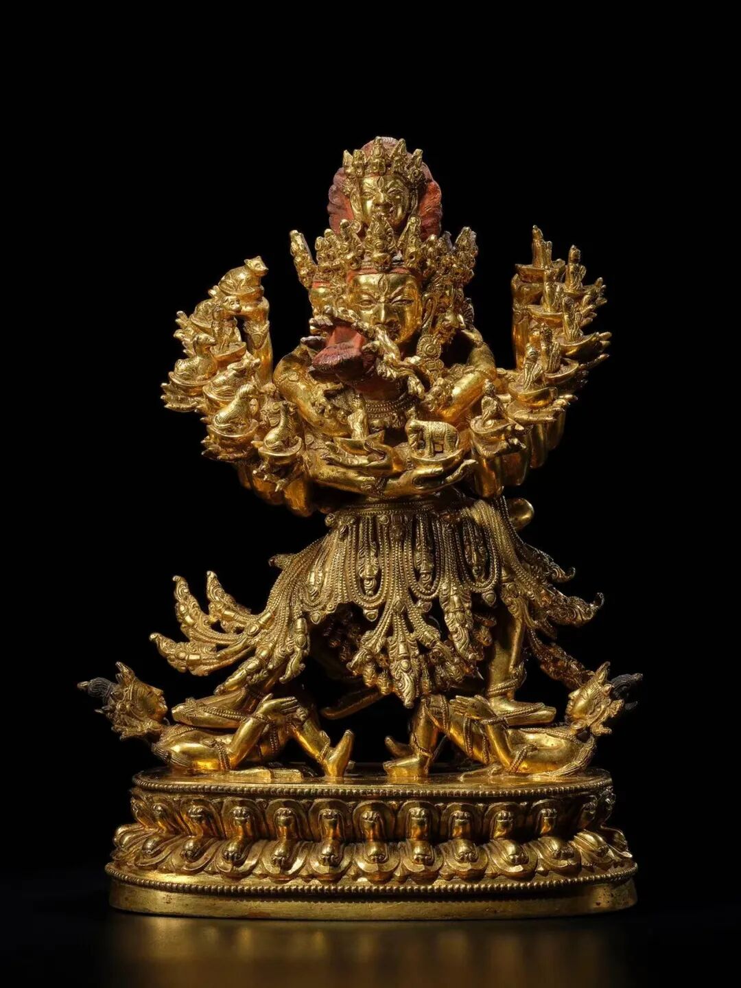 明清两朝佛教造像中以此明宣德(1426-1453年)铜鎏金喜金刚像最为瞩目。喜金刚为密宗无上瑜伽续之重要本尊,其十六只手臂顺势展开,各持嘎巴拉碗,其中八只盛装八种动物,象征八疾,另八只碗中则有八位天神,对应脱离各疾病之苦。其明妃为无我佛母,为众佛之母般若波罗蜜多菩萨之密宗形象。主尊与明妃起舞,为观者消除病痛,并赐以安康与财富。明初宫廷对藏传佛教极为热忱,造就了诸多工艺非凡的鎏金铜像,堪称中国藏传佛教造像的一座巅峰,此喜金刚像正是明初宣德风格之典范。