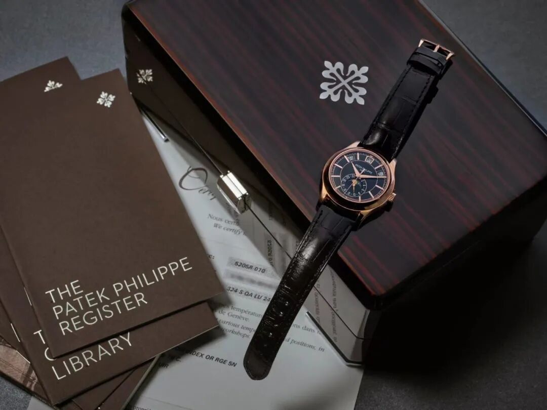 全新玫瑰金自动上弦年历腕表,配三针一线表盘,年份约2022。