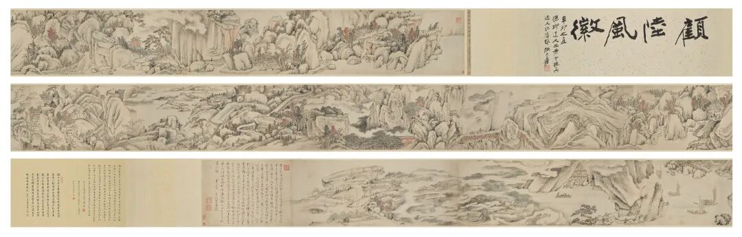 「姑熟画派」创始人萧云从(1596-1673),擅画山水,宗法元人,自成一家。本卷绘制于1649年,画家经历了战火连年后,亡国之痛在自跋中表露无遗;画面恢弘,笔墨表现充实,是画家参照元代文人画理念的心迹下,融入对自然山水的观察体悟,具体呈现清初遗民心怀的重要作品。上有张大千题引首,先后为过云楼及木扉珍藏,流传有绪,几经名家之手。后世研究萧云从者,大多有提及或参考本卷,故出版著录者极多,弥足珍贵。