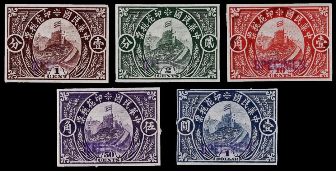 1913年长城图印花税票无齿样票全套五枚,盖紫色英文“SPECIMEN”,薄纸,非常罕见,上中品