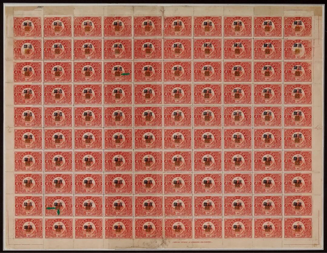 1920年长城图1角加盖“囍”字婚书专用印花税票加盖“直隶”新票整版一百枚,目前仅知存世2版,相当罕见,附原展页,著名税票收藏家蔡正钧旧藏