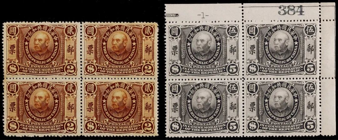 1912年共和纪念贰圆、伍圆高值新票四方连各一件,其中伍圆带右上直角张号纸边,原胶未贴,伍圆品像极佳
