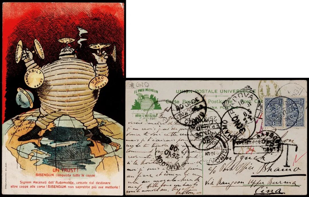 1908年意大立寄巴莫转寄腾越欠资明信片,此片未贴邮票欠资,销帕多瓦戳,经新加坡11月14日、仰光11月26日中转,巴莫11月30日到达戳,因投递多次无效转寄腾越,进口贴清蓝欠资4分双连,销腾越12月7日英汉半切小圆戳,保存完好,罕见清代进口欠资封