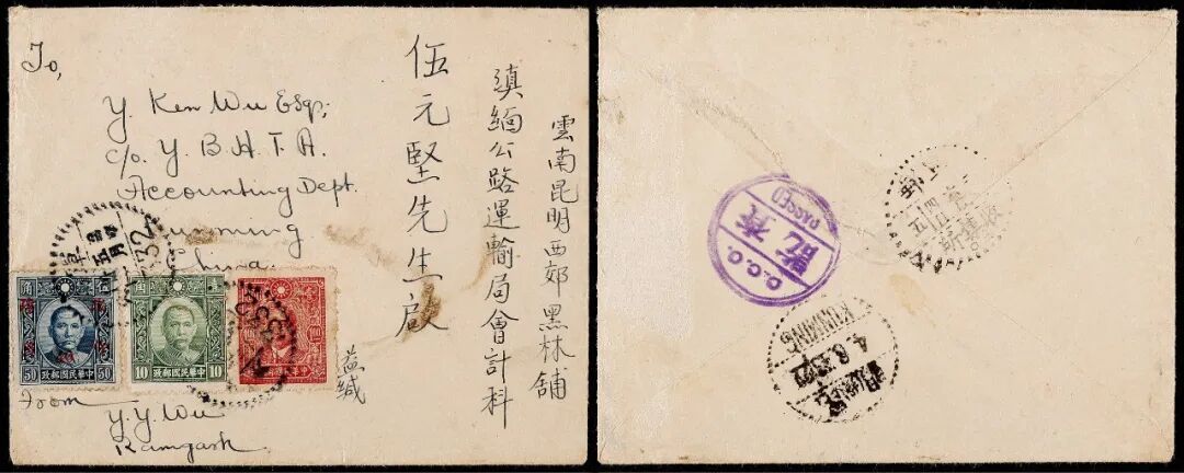 1943年印度远征军寄云南军邮检查封,小型西式封正贴孙中山像中信版1元、香港版1角及加盖改值4角各一枚,计邮资1.50元,盖军邮(332)5月31日戳,背分盖军邮收集所6月4日转戳,落地昆明(投)6月4日到达戳,封经驼峰航线寄递并盖有“C.C.O.查讫PASSED”印度远征军紫色双圈三格检查戳,保存完好,非常罕见