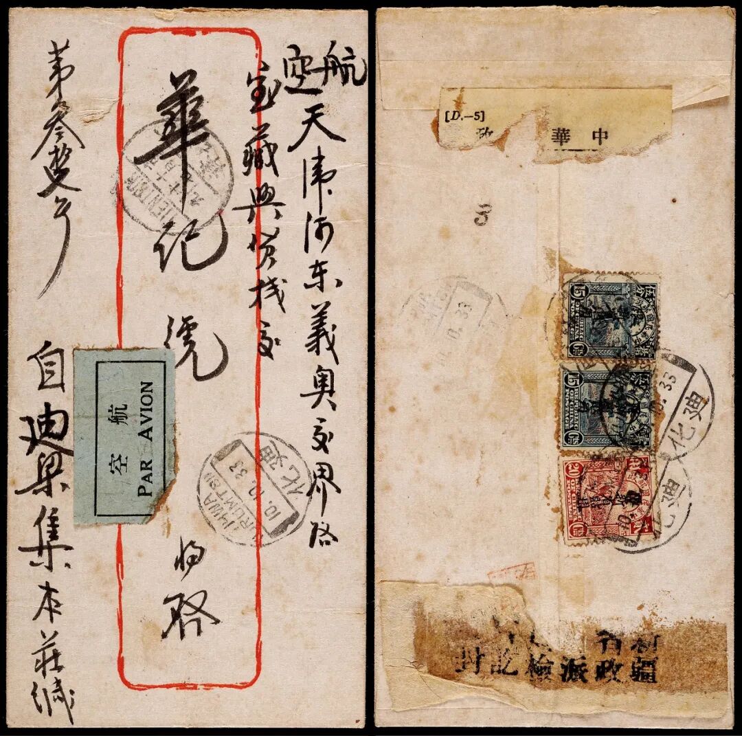 1944年迪化寄天津木戳手盖航挂检查封,红框封背贴“限新省贴用”农获20分一枚及手盖“航空”红色木戳15分两枚,合计邮资50分,盖迪化10月10日英汉腰框日戳,落地天津10月17日到达戳,封经检查并贴“新疆省政府派员检查讫重封”条,新疆木戳手盖“航空”限省贴用邮票贴用实寄罕少,保存完好