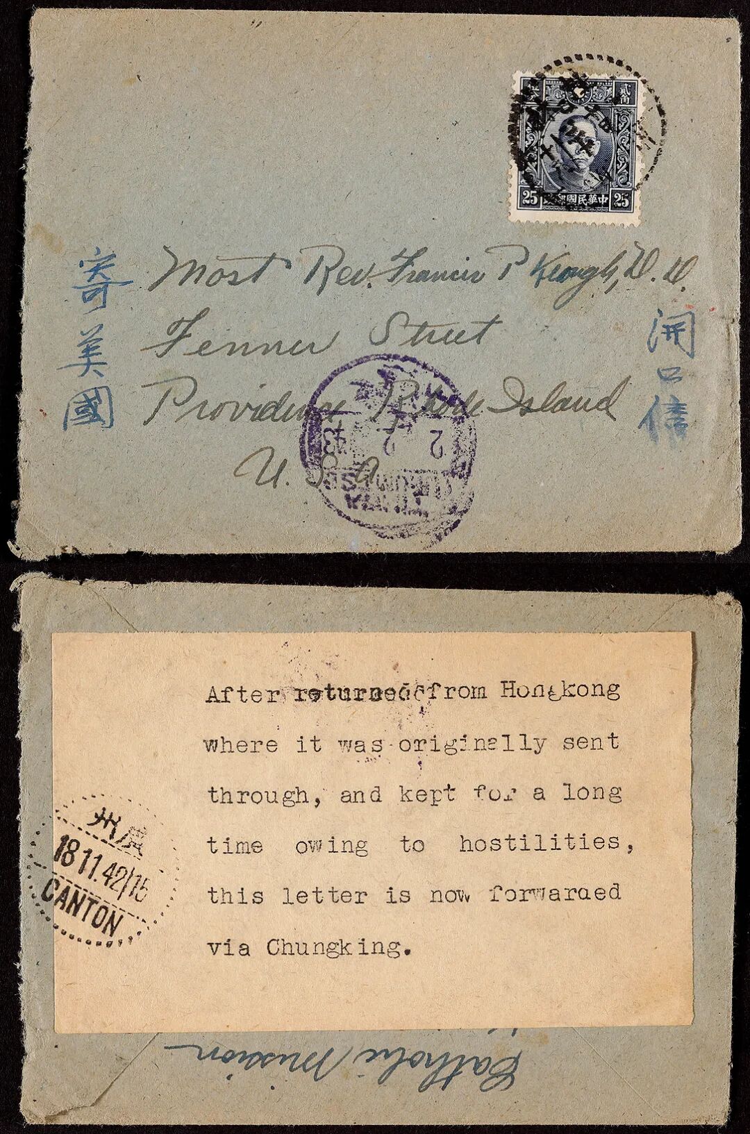 1941年桂林寄美国西式封,正贴香港版孙中山像25分一枚,盖桂林十月三十汉英三格点线日戳,因珍珠港事件,此信被滞留香港超过一年,背面贴邮局机打英文条说明情况,改由经重庆、迪化等地转寄,经盖广州1942年11月18日、迪化1943年2月2日中转戳,非常罕见之抗战时期邮路封,内含贺年信,保存完好