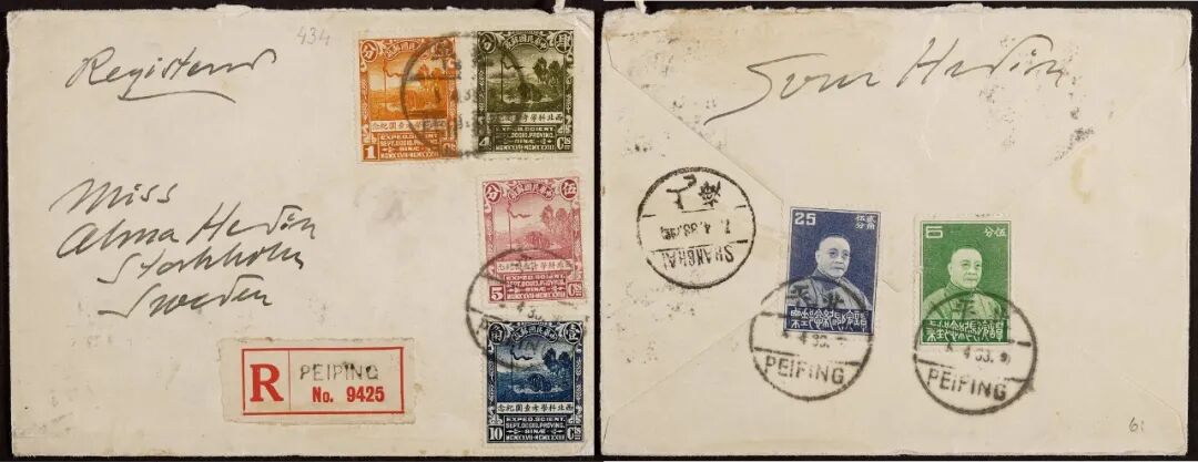 1933年北平寄瑞典斯文赫定封,贴西北科考全套四枚,谭院长5分、25分各一枚,销北平4月5日戳,经上海4月7日中转,背面封舌有斯文赫定博士亲笔签名,封品完好