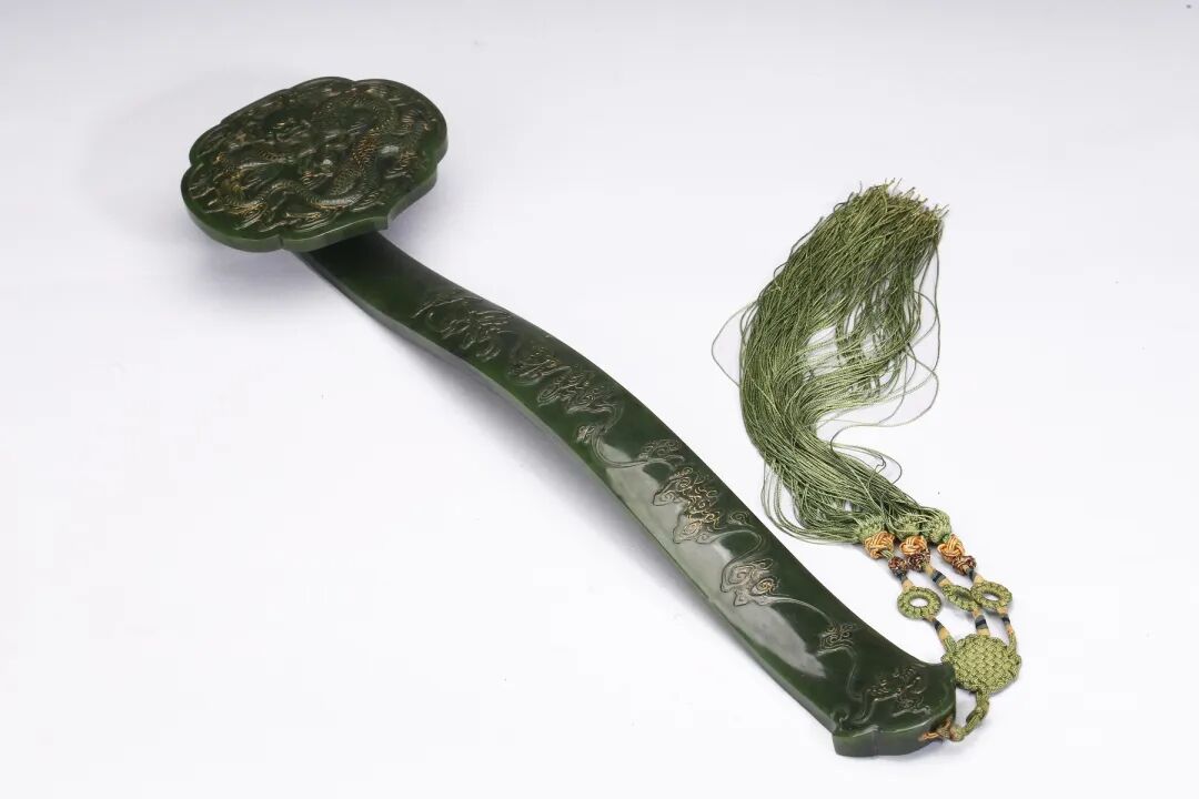 此如意以硕大碧玉为材雕琢而成,青翠莹润,内蕴精光,体量巨大,玉质温润光滑,触手润泽细腻,造型规制严谨,雕工精湛。如意作云叶式首,首面四周起如意云纹边框,内浮雕正面卷体的穿云升龙,龙头位于正中央,方头阔嘴,龙睛怒突。龙首颡顶圆凸,此为长寿瑞征,叉状龙角冲天直立,鬃毛细如游丝,须髯当风飘动,翻卷上翘。龙身作盘踞状又颇富身段之变化,展于龙首两侧,蜿蜒盘曲,直至横勾于龙首下方。龙身灵活夭矫而又挺拔有力,刚柔并济,深具凌空摇曳的层次感。四肢健硕,五爪回勾似鹰,充满动感。周身鳞片光鲜,鳞次栉比,雕琢细致入微。四周加以祥云锦地铺垫,更添腾云驾雾之象。龙首微低,似探向下方火焰珠,威不可犯,英姿神武。柄身中部隆起,自上而下渐宽,曲线优美。柄身正面浅浮雕三只作飞翔状蝙蝠,蝙蝠四周围绕祥云,最上面的蝙蝠并衔有磬佩。“蝠”等于“福”,寓意多福多寿, 十分精彩难得,实为宫廷重器。