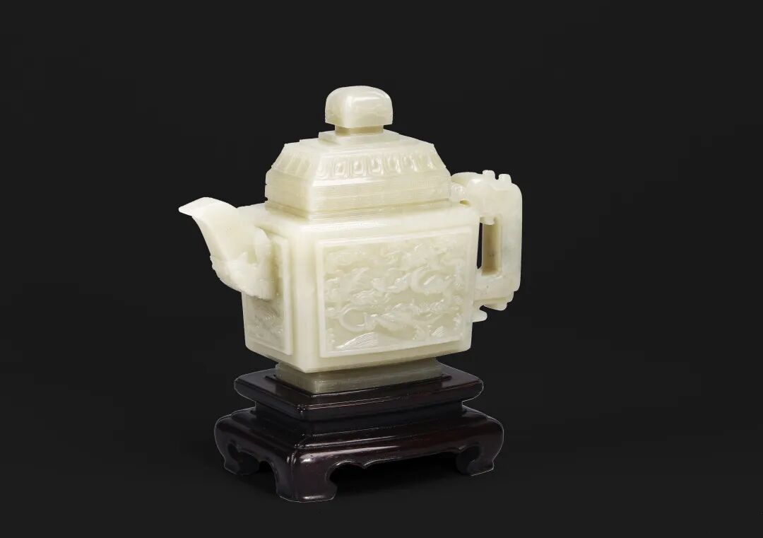 本器洁白细腻,如脂若冰,通体无暇无裂。器型饱满而秀美,造型特殊,一般玉壶为圆形居多,然此器呈四方型。掏膛厚薄均一,顶部子母口带盖,严丝合缝,盖钮饰“包袱纹”,盖上饰“莲瓣纹”,口沿部位分别琢回纹一周。腹部凸雕龙首为壶柄,局部留有和田籽料所带有的原皮色。折楞,龙首于肩部,似口含器身。器身方形四面开光饰”海水龙纹”,巨龙神态凶猛,造型逼真,海水奔腾,汹涌澎湃,侧身飞翔隐现于祥云海水之中。底呈四方型,雕刻“回纹”一 周。底足填金阴刻篆书「随安室」款识。随安室,又名“温室”,上有仙楼,原为供佛,即皇帝斋戒时的寝宫。整器取材优良,雕工精湛,设计精巧,法度谨严,实属难得佳品。