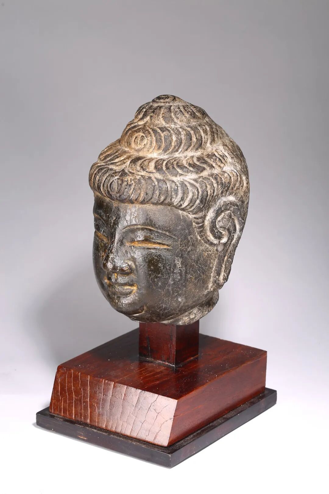 来源:约1980年代购于新泽西州家族遗产拍卖,纽约重要收藏家提供此石灰岩佛有漩涡发型,高肉髻,脸庞圆润饱满,眼呈俯视之态,眼睑微合,神态自信沉着,若从仰视的角度观看,佛的容颜就变得更温和亲切,实可为原设计之本意,体现了唐代造像高超的写实雕刻水平。可参考类似旧金山亚太博物馆藏唐代佛首。