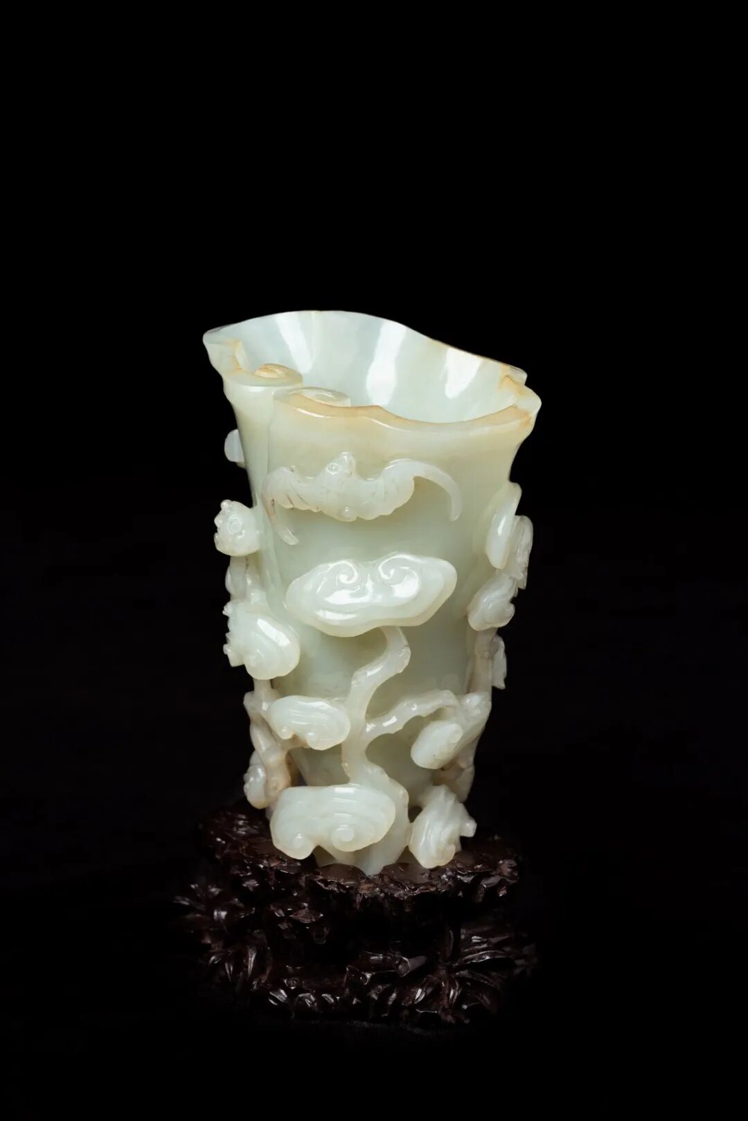 此花插玉质莹润光洁,包浆醇熟。采用深浮雕及透雕的表现手法,工艺极其精湛,灵芝型口,掏膛匀净,瓶身外采用高浮雕手法雕饰螭龙、灵芝、蝙蝠。大小螭龙方脸尖耳,身体弯曲,瘦长健硕,肢体遒劲,盘绕瓶身,长尾分叉、末端上卷;灵芝根壮叶茂,叶冠饱满;蝙蝠情态生动有趣,圆转流畅,寓意美好,有大福大寿之意。整器取材珍贵,构思精巧,用料精良,抛光细腻,工艺精细,为不可多得的文房用品。带红木'山石'底座。