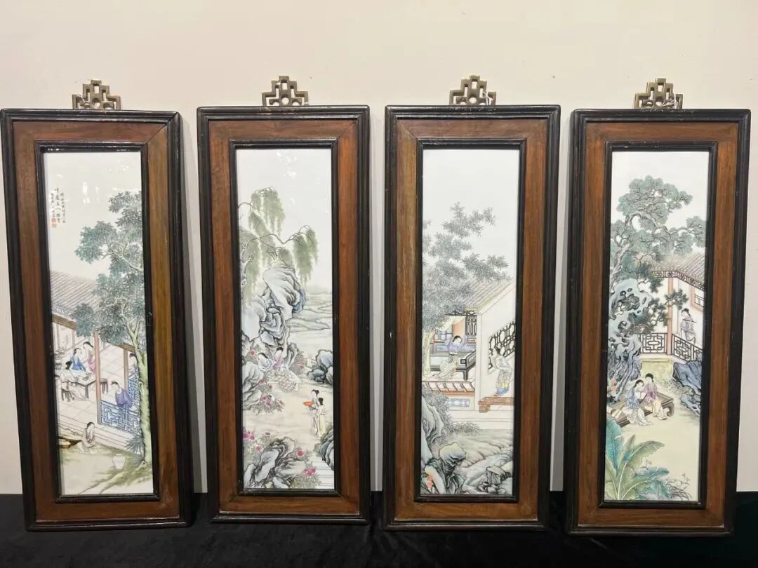 王琦是“珠山八友”的创始人,被认为是中国现代瓷器史上最有影响力的陶艺家之一。他的风格通常很有表现力,有夸张的人物和草书。但在这件创作于1926年的例子中,它表现出一种相当古典的风格,可以在清代中期的皇家瓷器中找到。它描绘了中国著名小说《红楼梦》中的故事,人物、岩石和亭台楼阁都画得很精美,色彩鲜艳, 并且在人物的刻画上,有王琦早年学习钱慧安仕女画的影子。整器制作精湛,四屏皆全,材质精良,保存完好,挂于书屋之中,文气十足。我们认为此套瓷板为王琦早期的一件罕见仿乾隆瓷器风格的作品,瓷板下方的仿乾隆印章可进一步证明这一点。王琦为“珠山八友”之首(1884-1937), 其初以捏面人为生,后向邓碧珊学画瓷板肖像。先以钱慧安仕女画为蓝本,后于1928年后改学“扬州八怪”之一的黄慎,晚年的作品开始摆脱钱慧安和黄慎的影子,在继承中有了自己的特征,以写意人物画见长,其人物绘画技艺超凡脱俗。款识:时在丙寅(1926)秋月以为炜庐主人雅赏,西昌匋迷写。