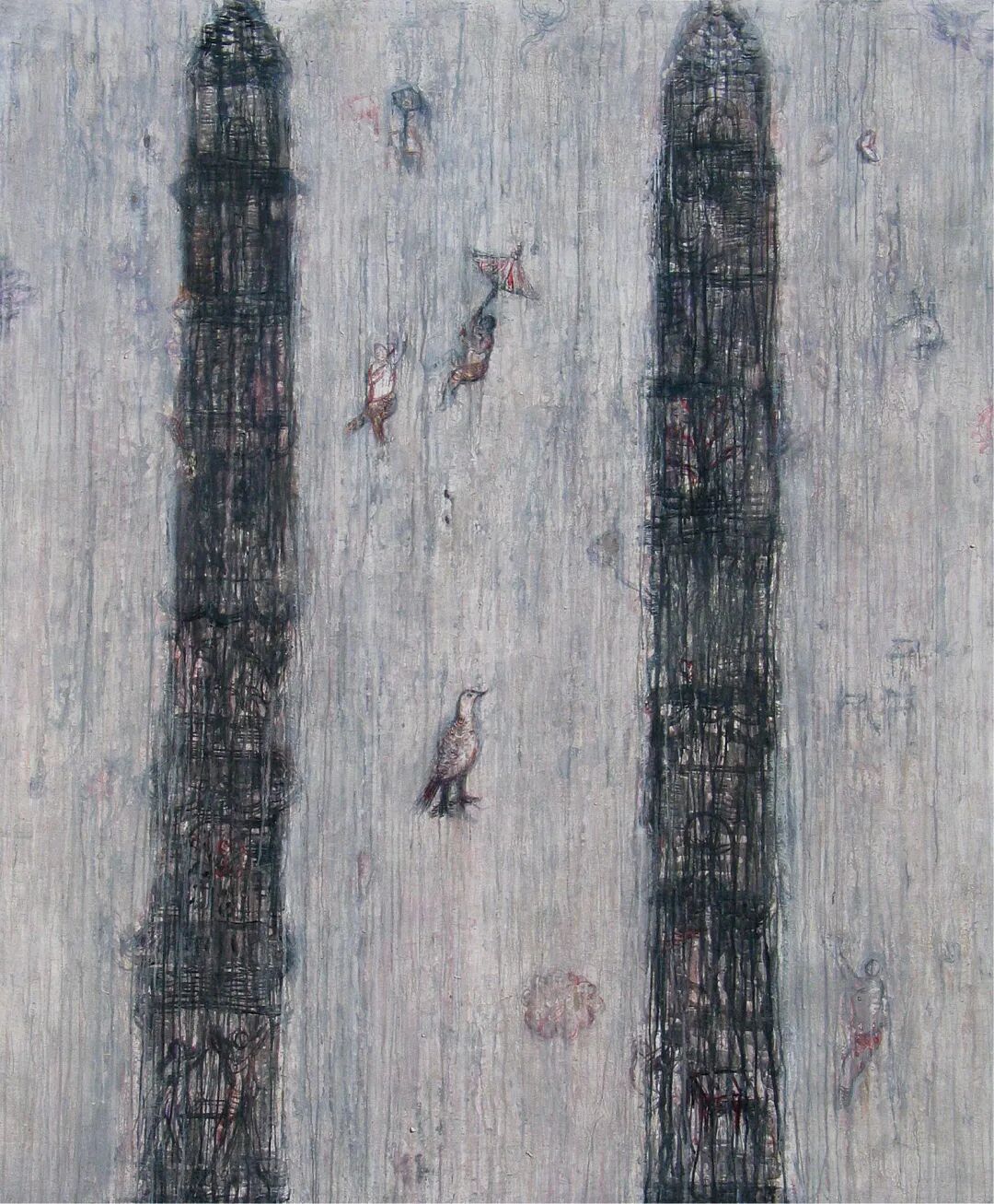 这幅作品创作于2008年,这不得不让人联想起08年的汶川大地震,或许是一种巧合,又或许是李继开对于现实生活的真挚反映。他的绘画题材大都与人类命运相关,营造出一种“末日废墟”的场景,呈现出荒芜、疏离之感。对于生命与死亡的迷思,对于内心孤独与惘然的表达……画中孩童的种种落寞无力的神态,勾勒出一个个令人心悸的幽闭世界。正如这批70后艺术家,他们处于社会变革的关键时期,面对着日新月异的发展,仿佛生活在夹缝中,茫然无措。通过他们的作品,一种强烈的被遗弃的感觉油然而生,同时伴有莫名的感伤、内心的怀疑、纠结和孤独感,这似乎暗示着他们这一代人普遍的心理情态。