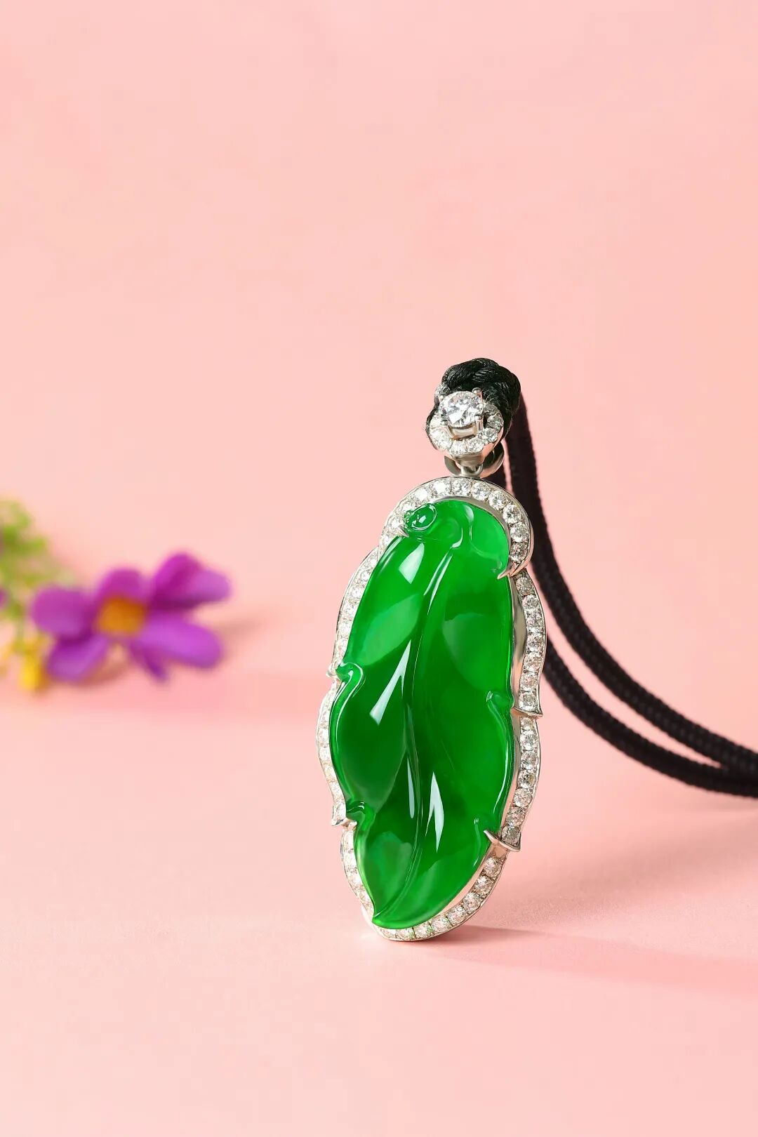浓阳绿「叶子」翡翠配镶钻石吊坠项链