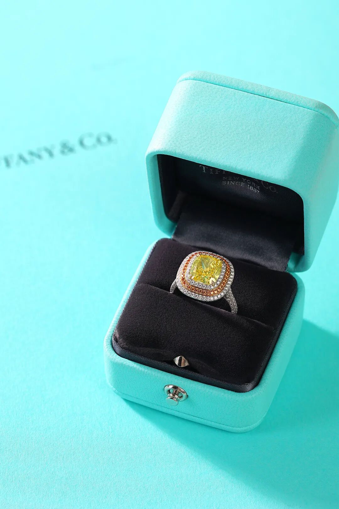 18K黄金与铂金相结合,主石为3.30克拉的艳彩黄Fancy Vivid Yellow ,净度SI,190颗配钻D-G色,共0.57ct.戒臂刻有Tiffany&CO钢印,有Tiffany独家盒子、证书以及购买凭证。